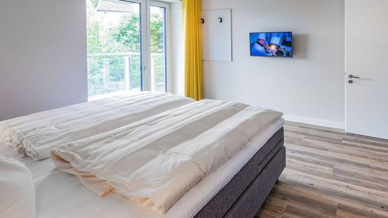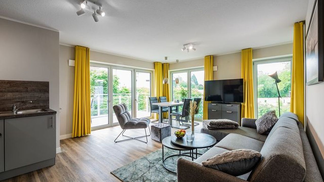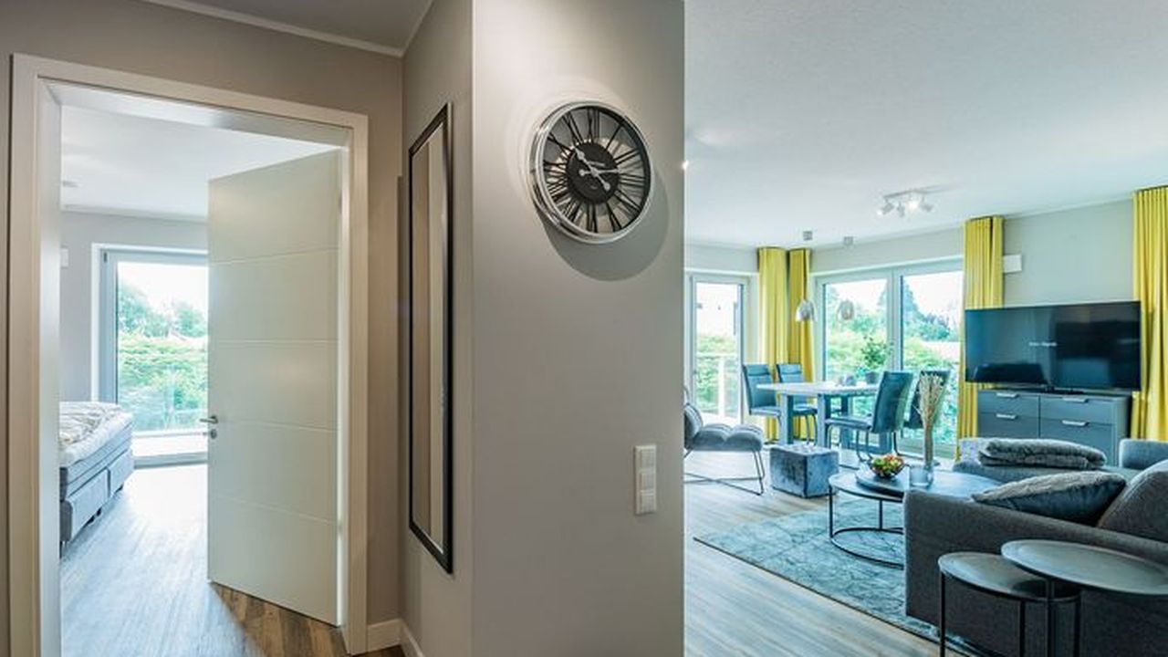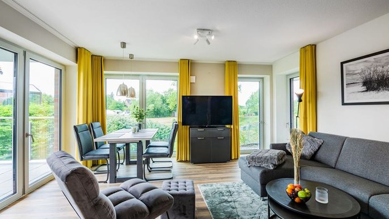 DIe Appartements der Kategorie D2 R2 in unserem Ferienhaus Elbbrise bieten Ihnen eine komfortable Ferienwohnung mit einem separaten Schlafzimmer, einem offenen Wohn-, Koch- und Essbereich und einem Landblick Balkon.Ausstattung auf einen Blick: