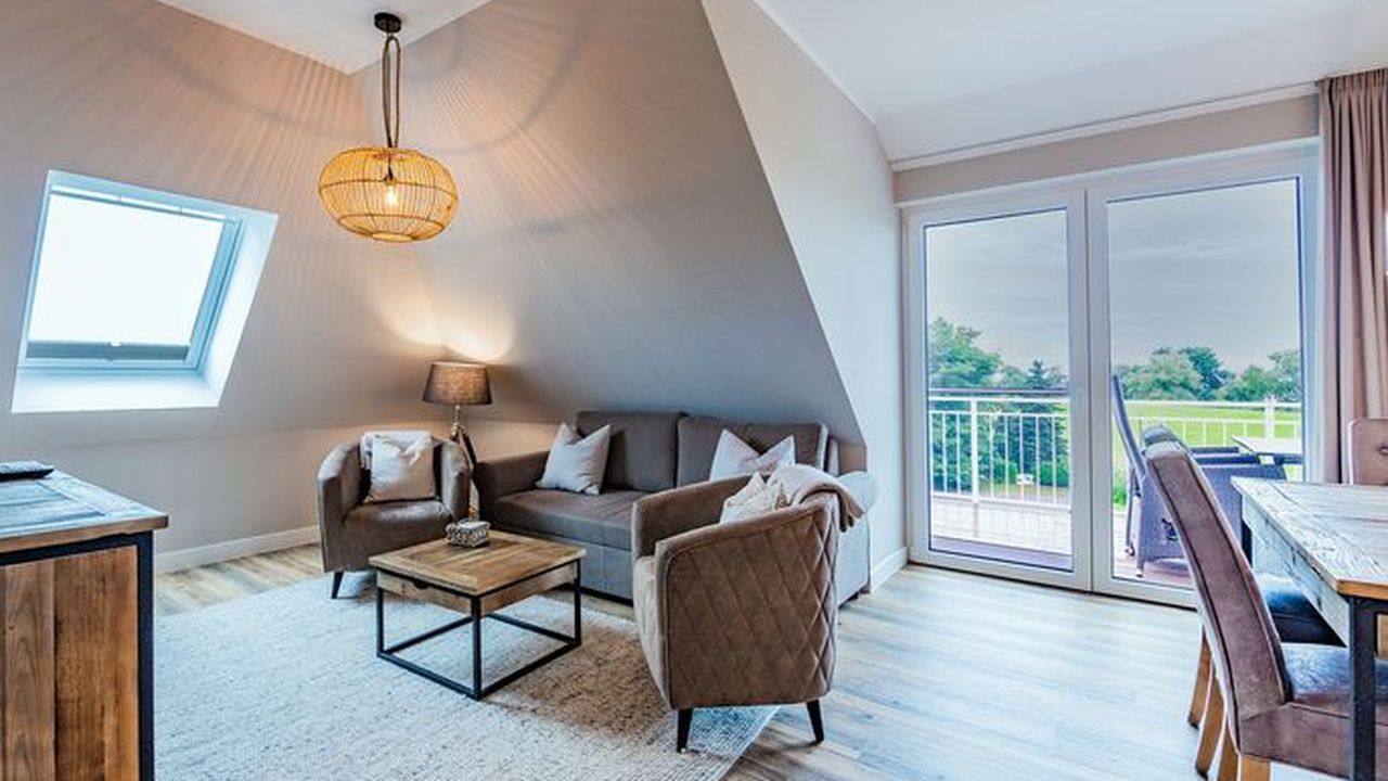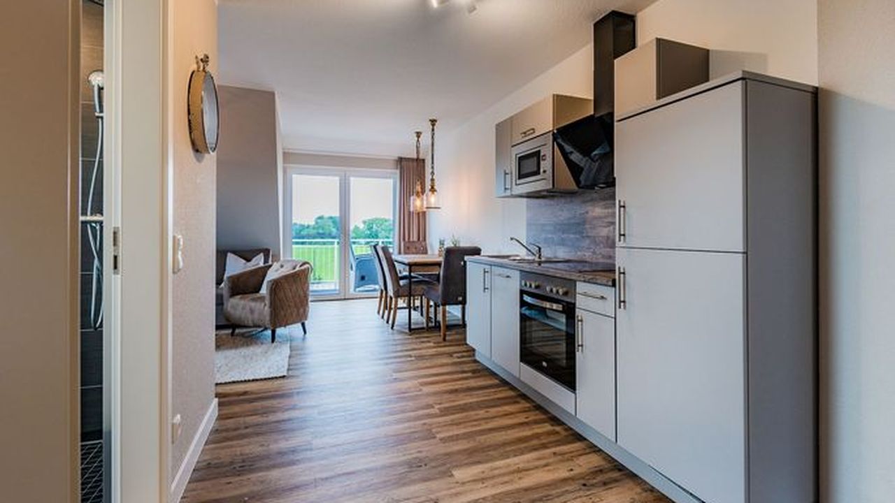 Die Wohnungen der Kategorie D4 R2 im Haus Elbaussicht verfügen über ein separates Schlafzimmer, einen Wohn-, Koch- und Essbereich und einem Balkon mit Elbblick.Ausstattung auf einen Blick:
