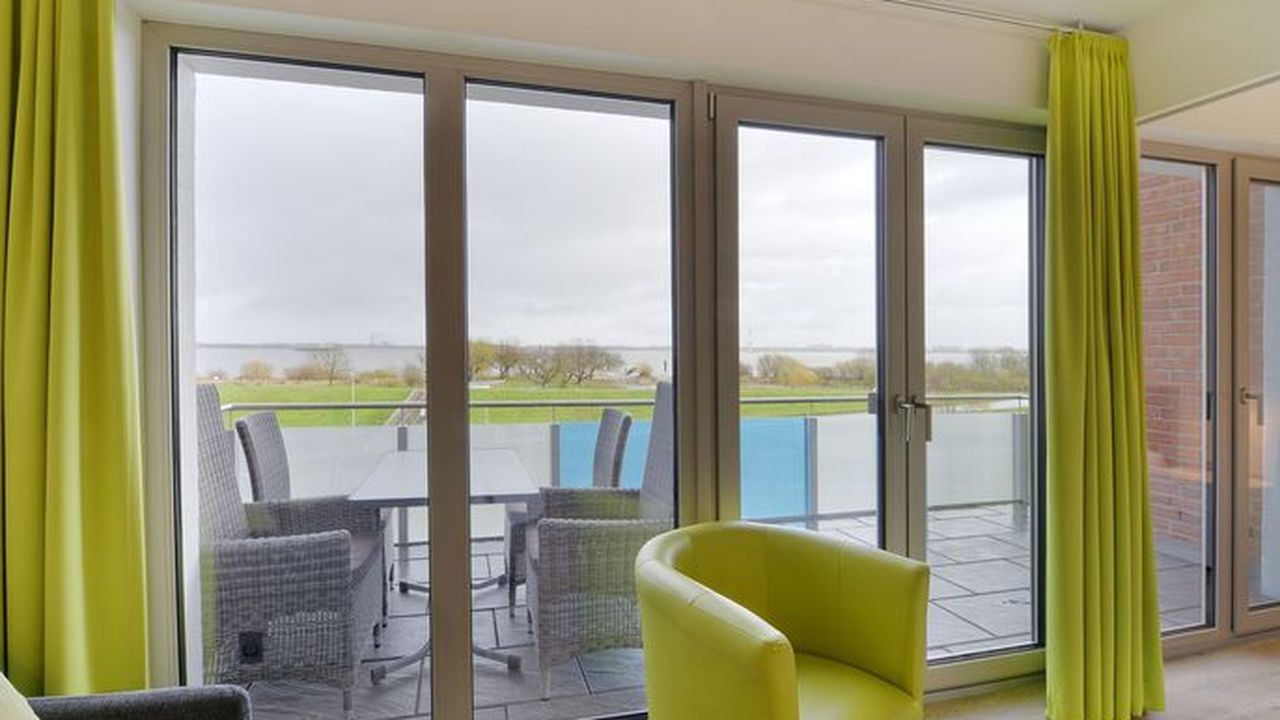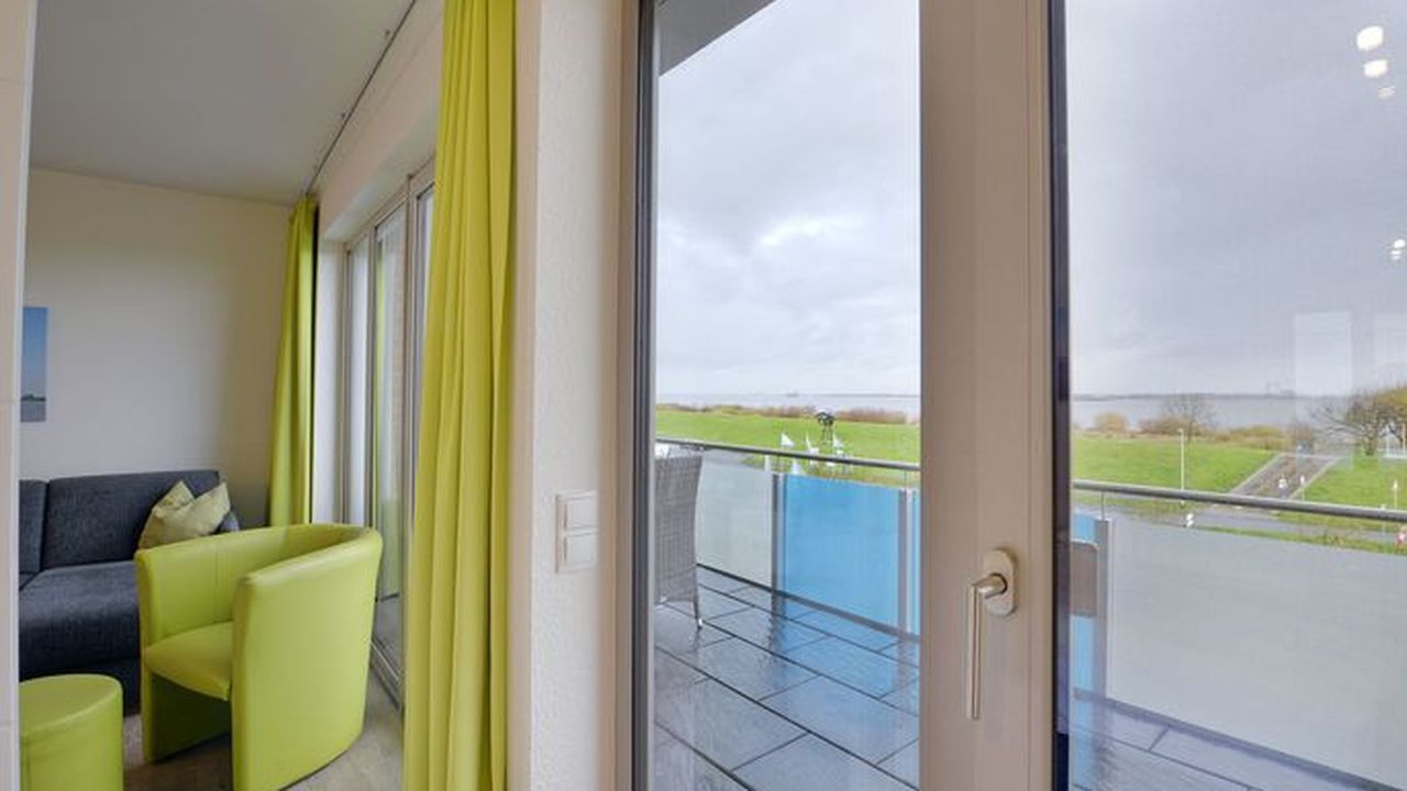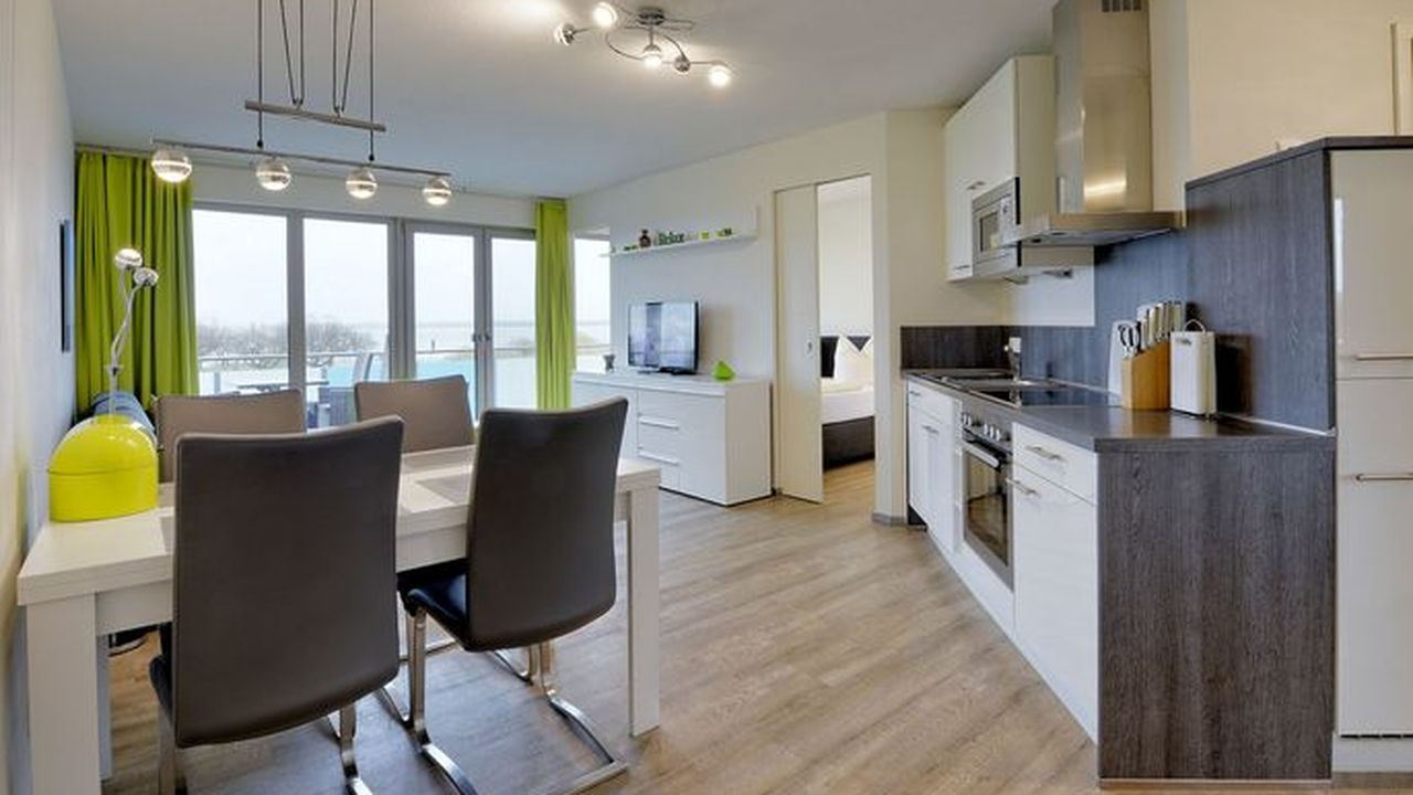 Die Appartements der Kategorie D3 R3 im Haus Lee verfügen über zwei separate Schlafzimmer, Wohn-, Koch- und Essbereich sowie einem Balkon mit direktem Blick auf die Elbe.Ausstattung auf einen Blick: