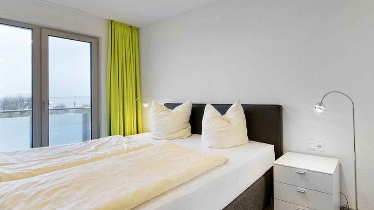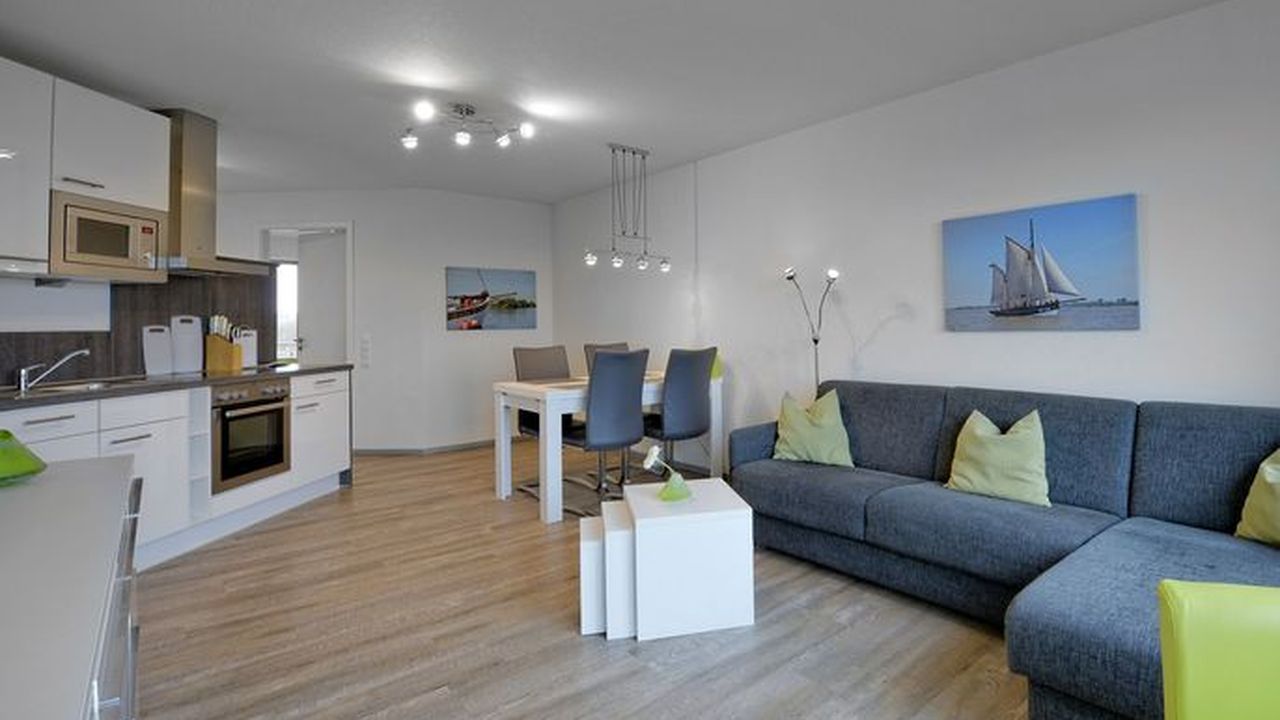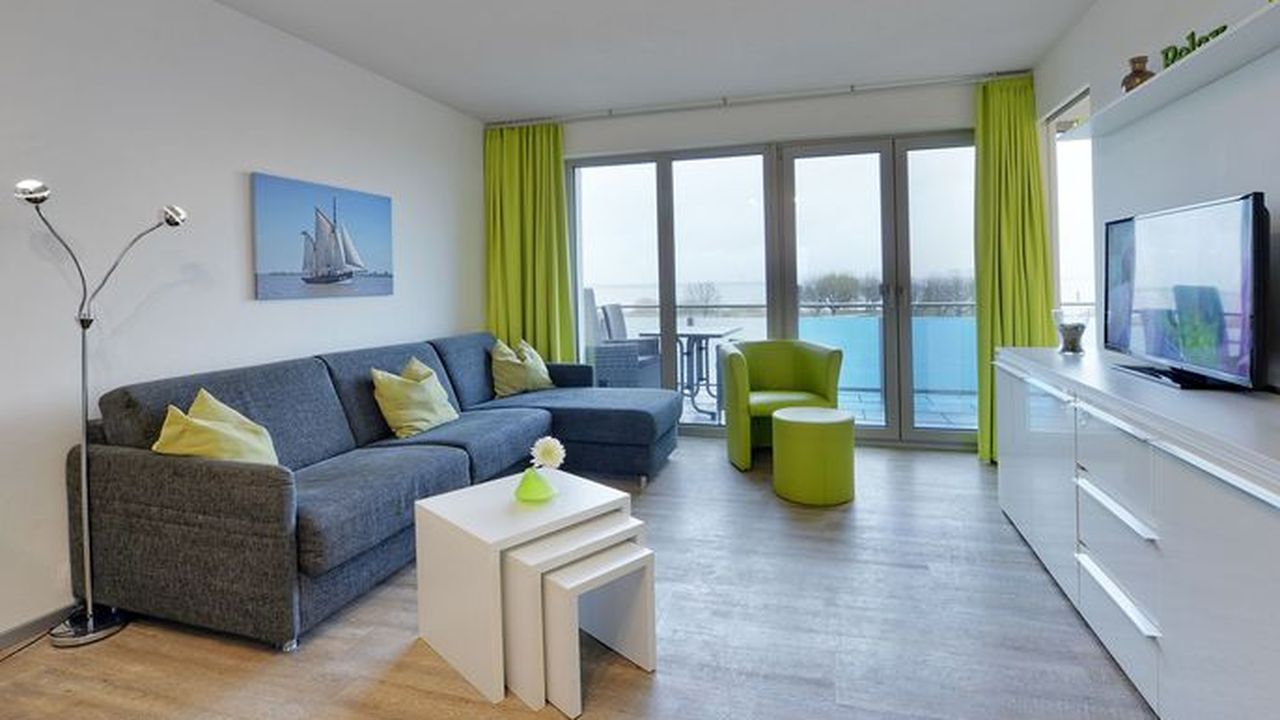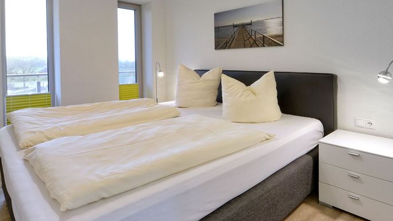 Die Appartements der Kategorie D3 R3 im Haus Lee verfügen über zwei separate Schlafzimmer, Wohn-, Koch- und Essbereich sowie einem Balkon mit direktem Blick auf die Elbe.Ausstattung auf einen Blick: