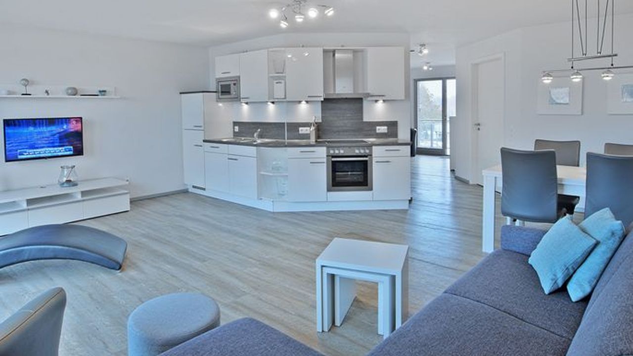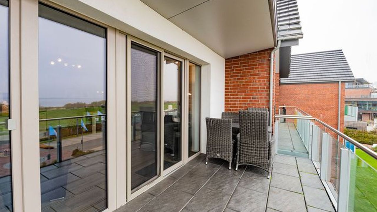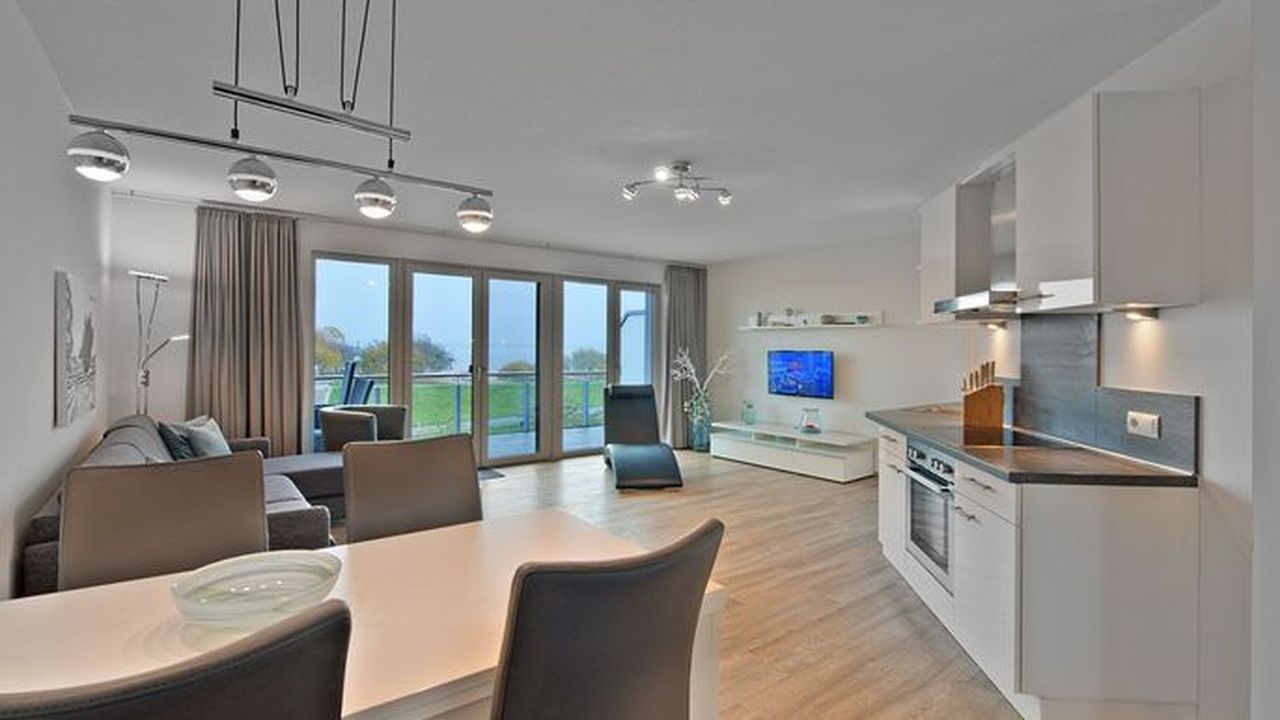 Die Appartements der Kategorie D4 R2 im Haus Lee verfügen über ein Schlafzimmer, Wohn-, Koch- und Essbereich und einem Balkon mit direktem Blick auf die Elbe.Ausstattung auf einen Blick: