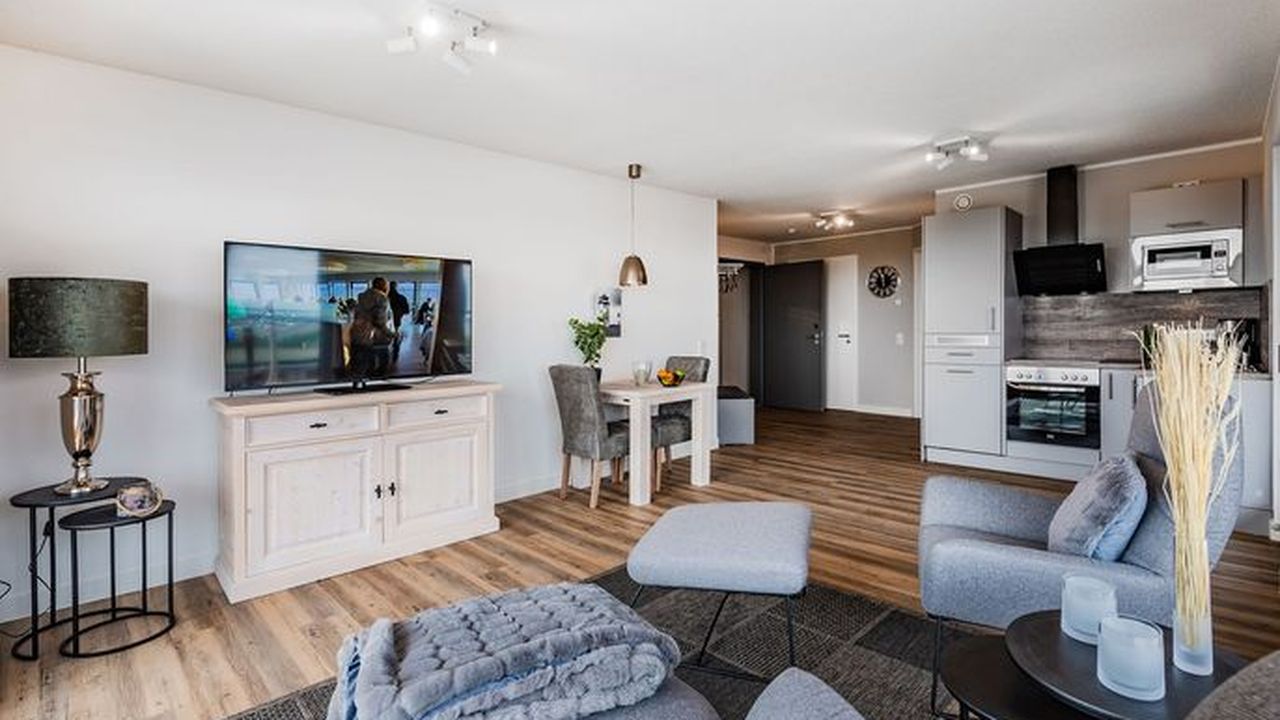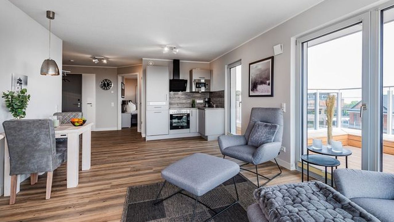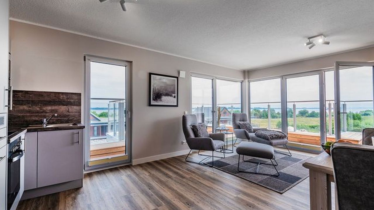 DIe Appartements der Kategorie D6 R2 in unserem Ferienhaus Elbbrise bieten Ihnen eine komfortable Ferienwohnung mit einem separaten Schlafzimmer, einem offenen Wohn-, Koch- und Essbereich und einem Balkon mit Blick auf die Elbe.Ausstattung auf einen Blick: