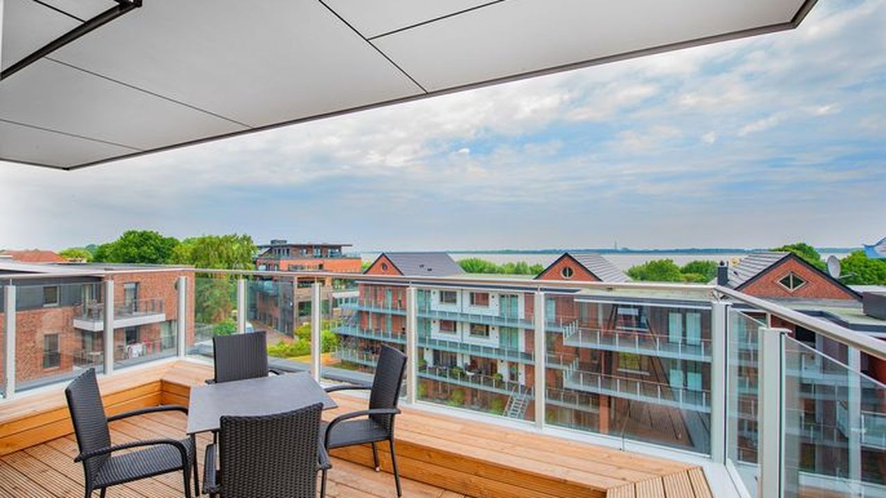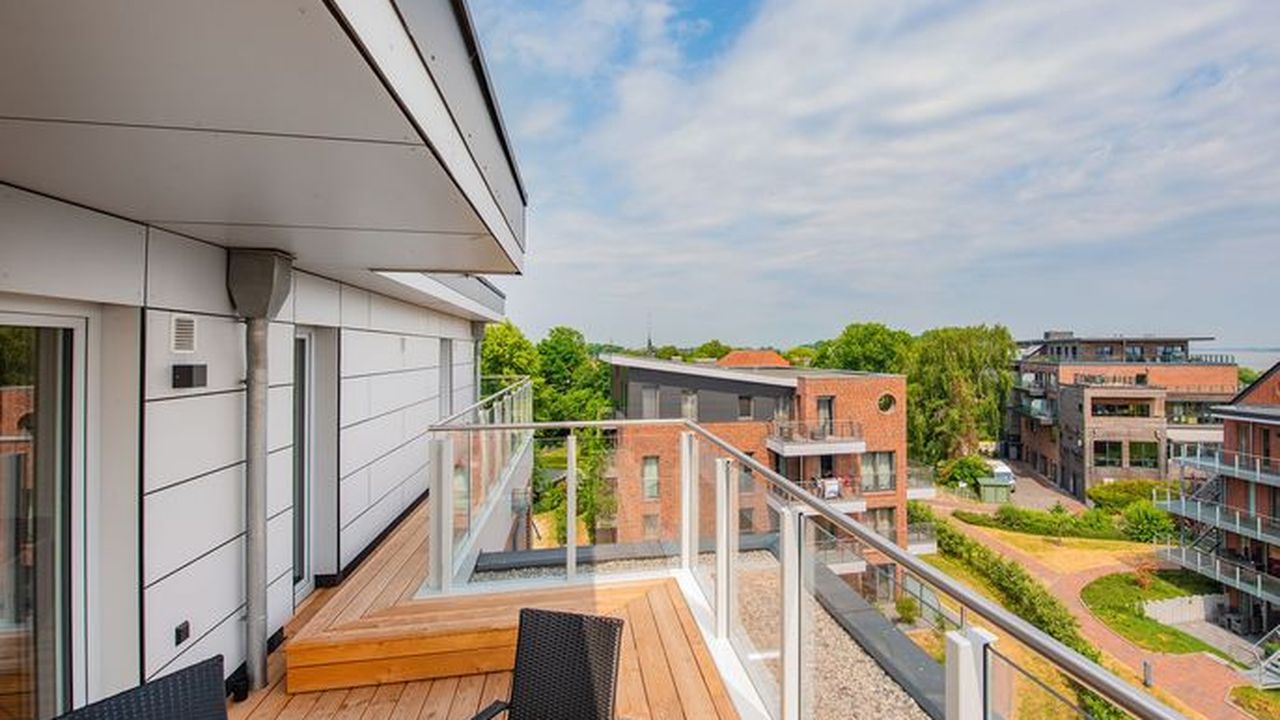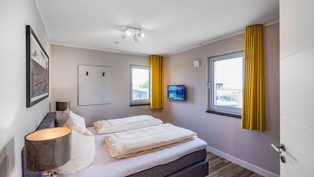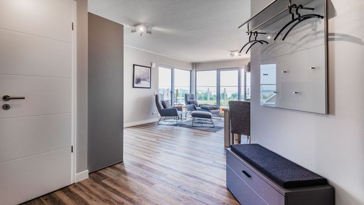 DIe Appartements der Kategorie D6 R2 in unserem Ferienhaus Elbbrise bieten Ihnen eine komfortable Ferienwohnung mit einem separaten Schlafzimmer, einem offenen Wohn-, Koch- und Essbereich und einem Balkon mit Blick auf die Elbe.Ausstattung auf einen Blick: