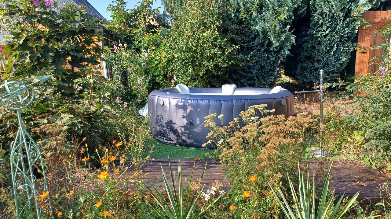 Auf dem über 700qm Grundstück erwarten Sie ein Hexen-Saunahaus mit tollem Blick und gemütlichen Vorraum, ein Kaffee-/Freizeithaus, ein Sonnenplatz, eine Feuerstelle, in warmen Zeiten ein Grillplatz, Whirlpool, Solardusche, Bachlauf-Oase mit einem kleinen Teichbiotop.