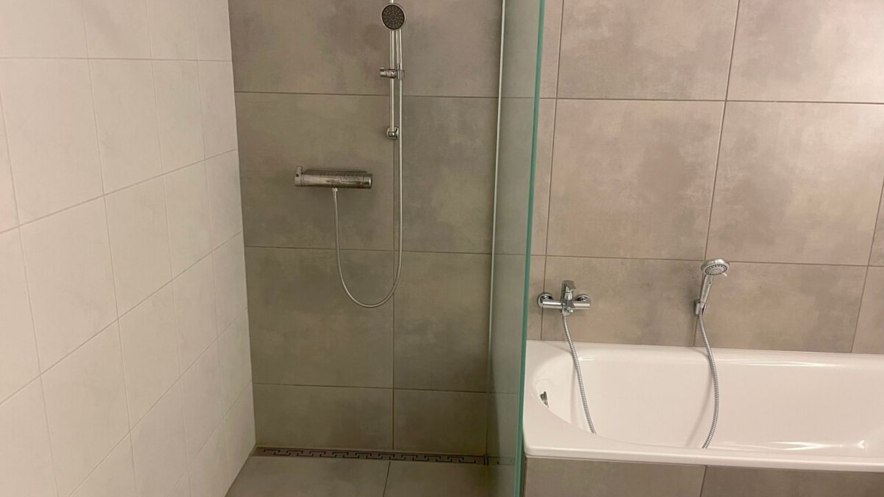 Großes Bad mit Dusche, Badewanne und Doppelwaschbecken