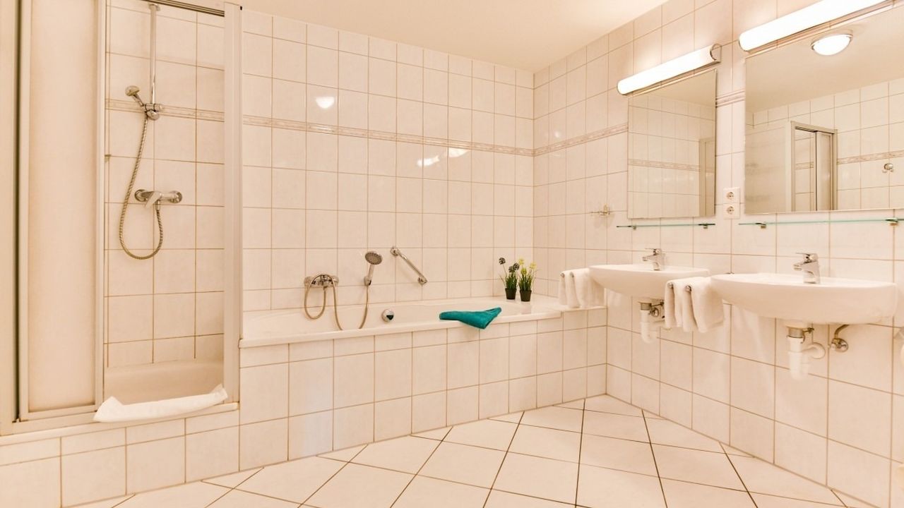 Großes Bad mit Dusche, Badewanne und Doppelwaschbecken