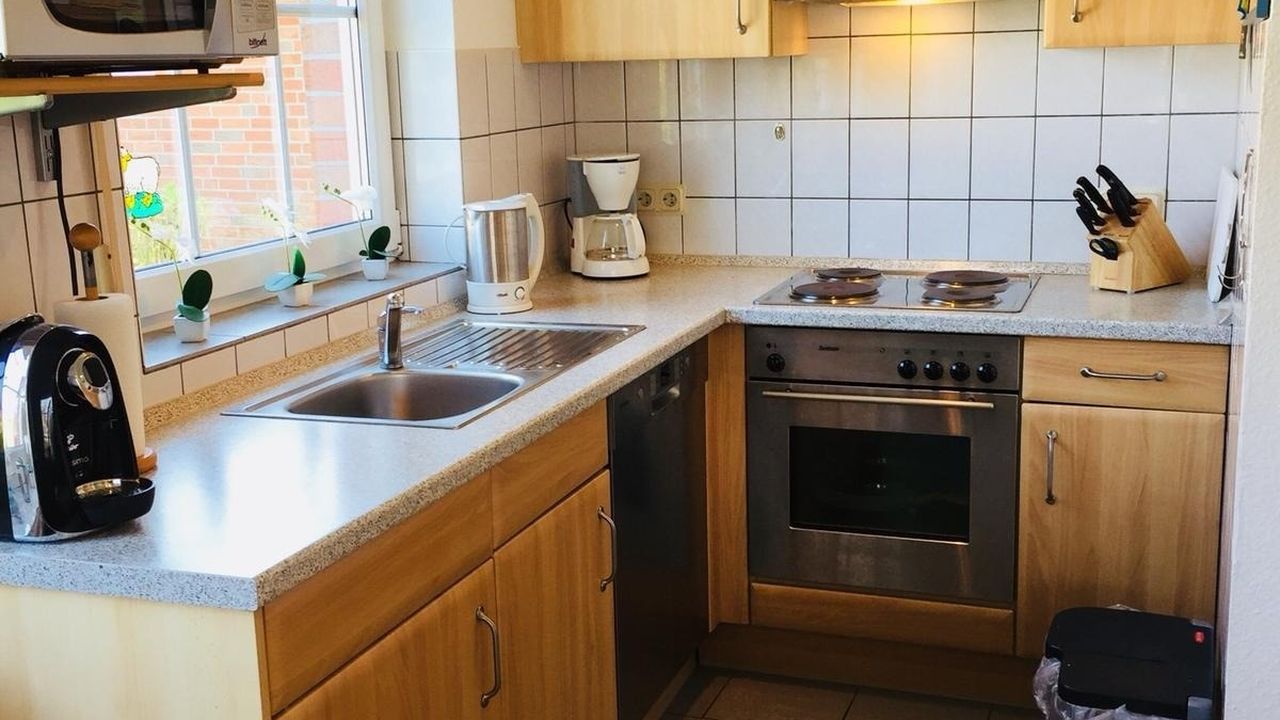 Küche mit offenem Wohn-/Essbereich inkl. Kühlschrank, 4-Platten Herd, Backofen, Microwelle, Filterkaffeemaschine und Kaffeepadmaschine und einem Essplatz für 4 Personen