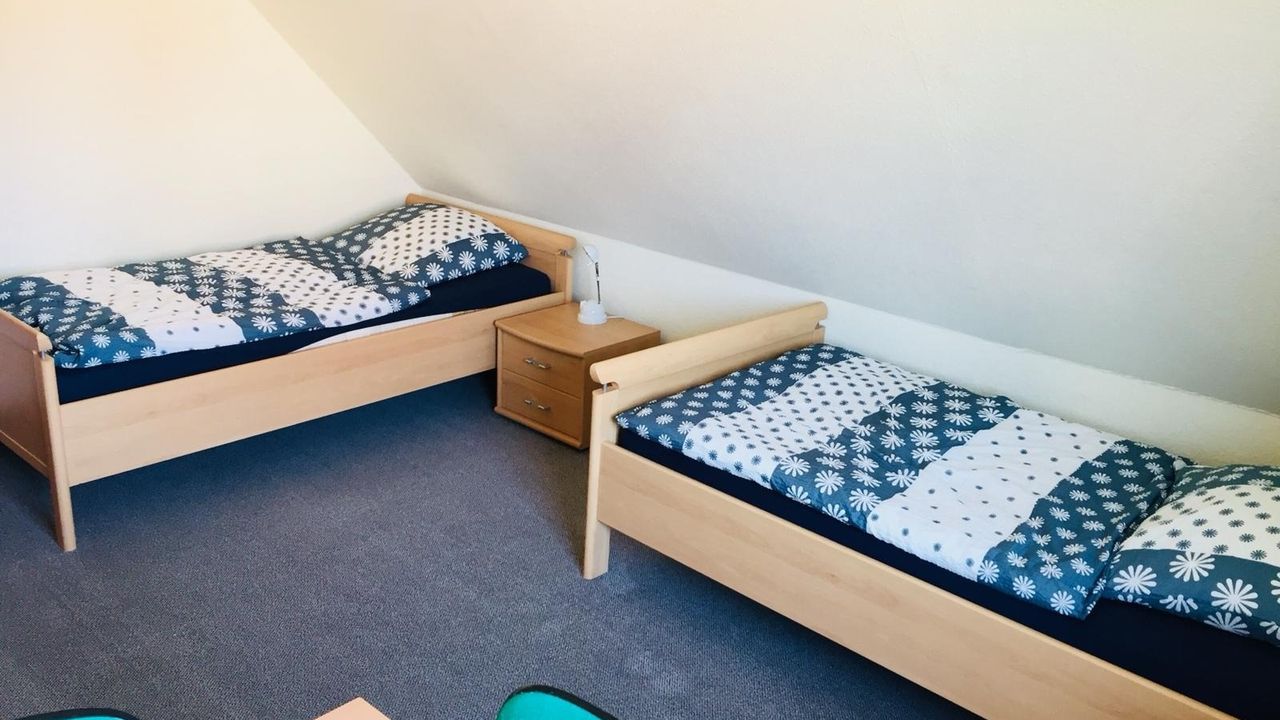 Schlafzimmer 2 mit zwei Einzelbetten (100 x 200 cm) und Kinderhochstuhl; im Kleiderschrank befindet sich ein Reisefaltbett für Kinder (mit Schlupf, Liegefläche ca. 60 x 120 cm), welches bei Bedarf aufgebaut werden kann