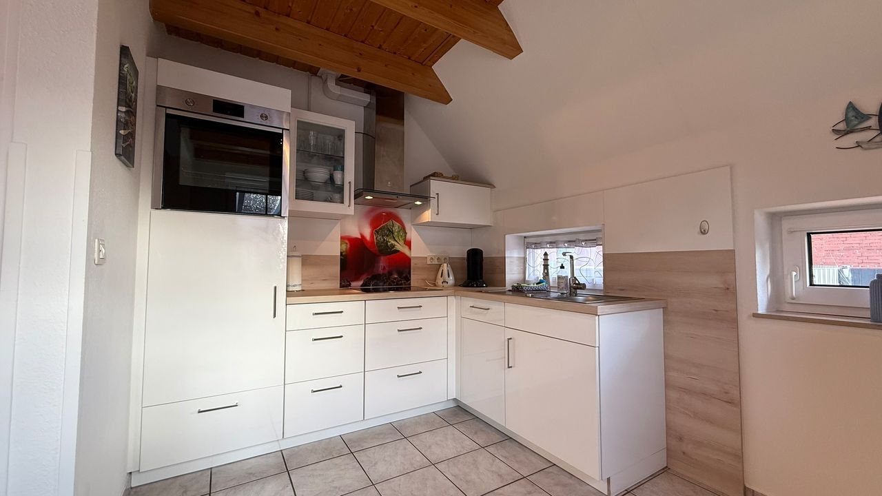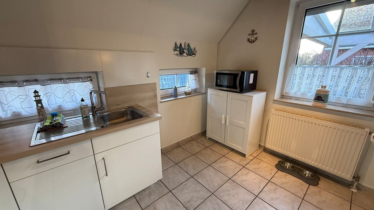 Genießen Sie Ihren Urlaub in vollen Zügen, bei schönem Wetter auch draußen auf der Terrasse. In der gut ausgestatteten Küche finden Sie neben einem Kühlschrank auch eine Mikrowelle und einen Backofen.