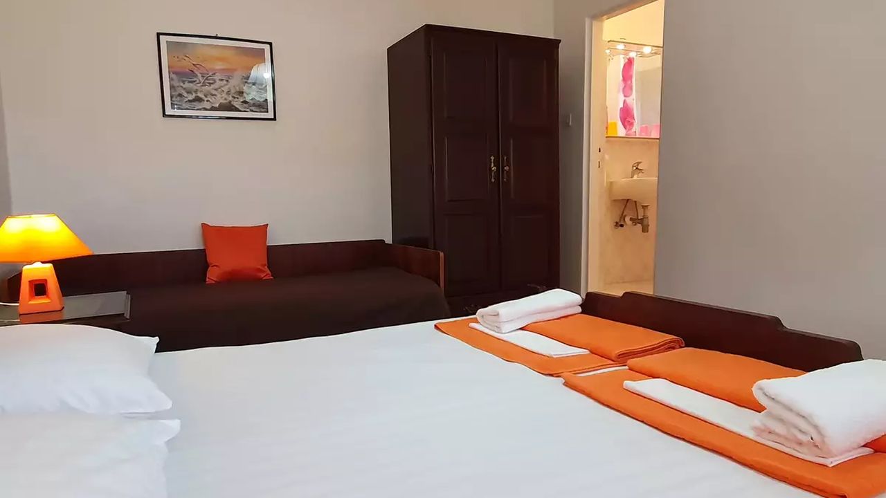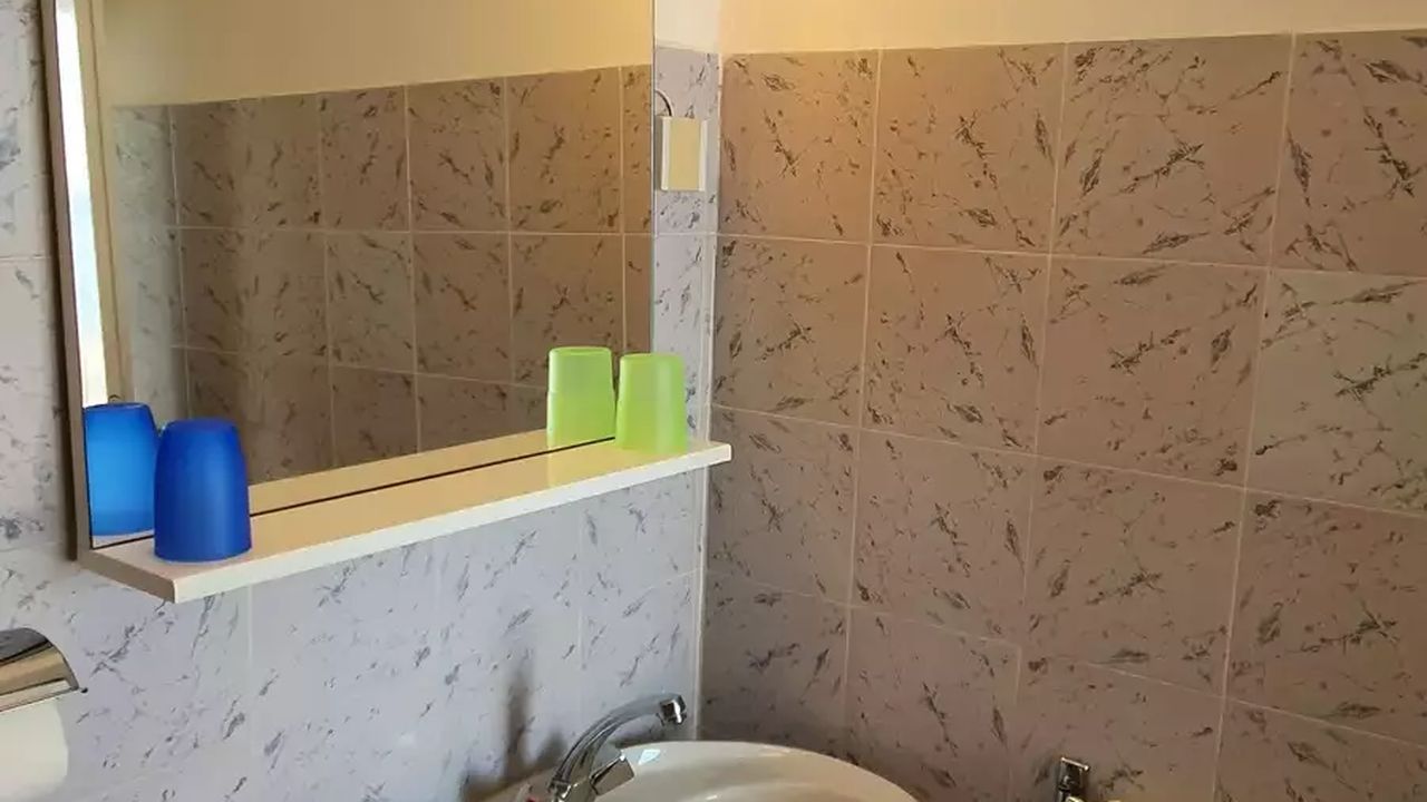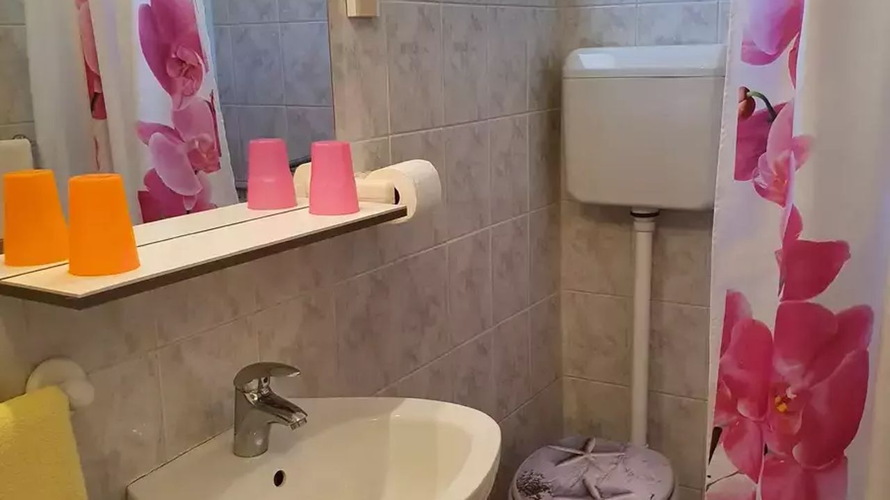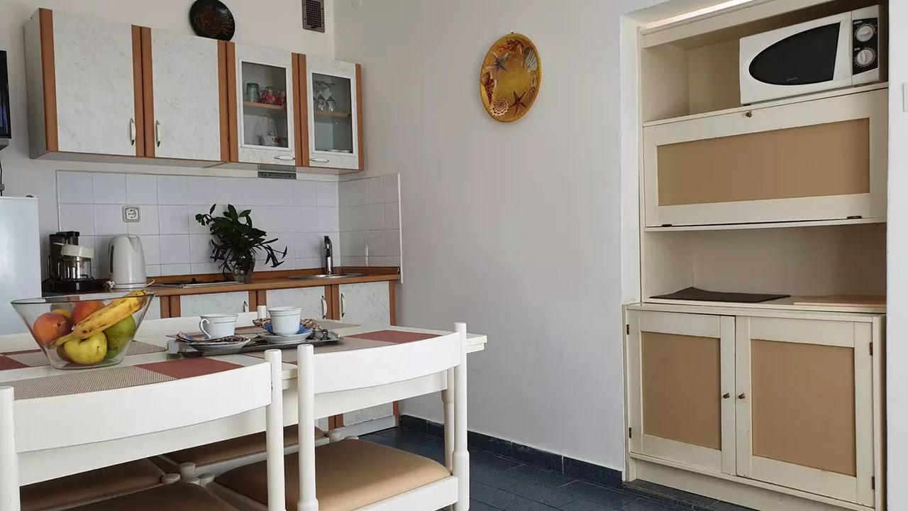Die zweite Wohnung im 1. Obergeschoss ist f and uuml;r 4-5 Personen geeignet. Sie bietet zwei Schlafzimmer mit eigenem Badezimmer, eine praktische K and uuml;che mit Essbereich sowie einen Balkon und eine Terrasse mit Meerblick. Einfach, aber funktional, ist sie perfekt f and uuml;r Familien oder Freunde, die einen komfortablen Aufenthalt suchen.