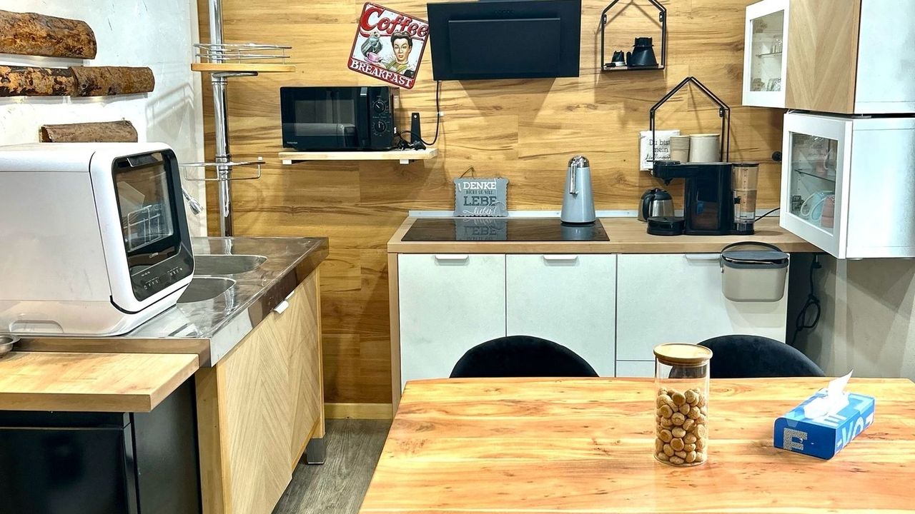 Die gut ausgestattete Küche besitzt unter anderem einen Kühlschrank, einen Herd zum Kochen und sogar eine Spülmaschine.