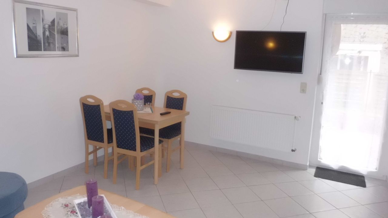 Befindet sich im EG und hat einen separaten Eingang. Die Terrasse ist mit gemütlichen Gartenmöbeln (Tisch und Stühle) und einer Gartenwiese ausgestattet.