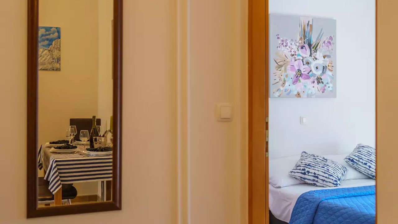 Die erste Wohnung eignet sich ideal f and uuml;r 2 bis 3 Personen und verf and uuml;gt and uuml;ber ein separates Schlafzimmer, einen gem and uuml;tlichen Wohn-/Essbereich mit Meerblick, eine voll ausgestattete K and uuml;che sowie ein modernes Bad mit Dusche.