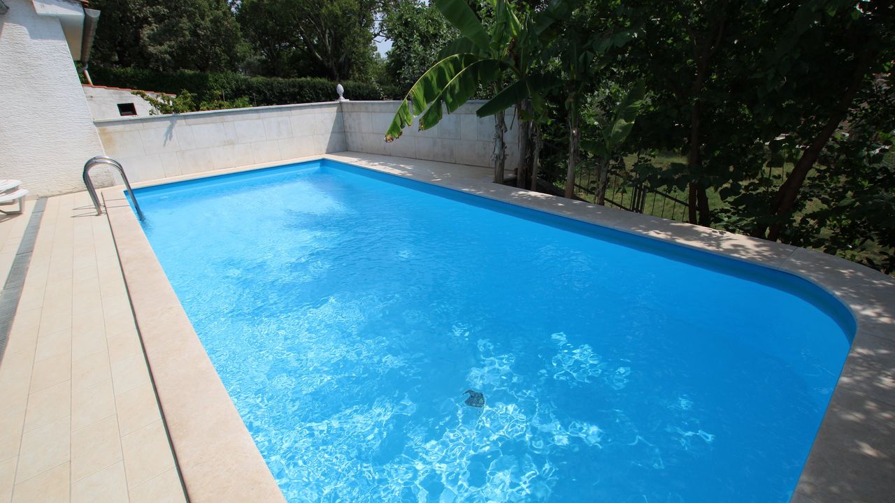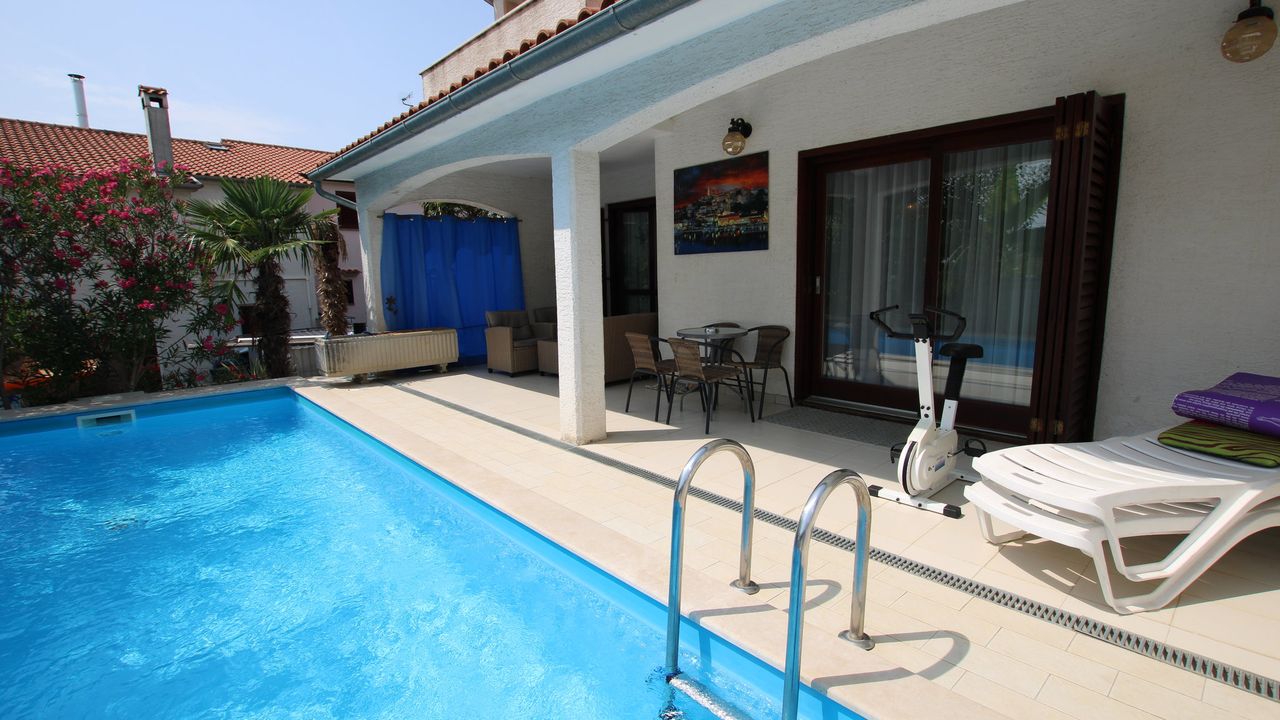 Die Terrasse ist überdacht mit direktem Zugang zum Pool. Ein Fitnessbike ist ebenfalls vorhanden.
