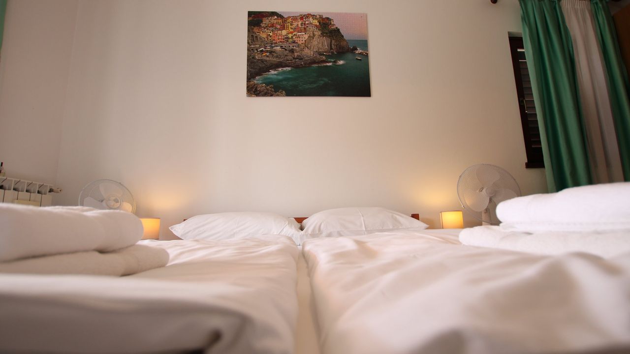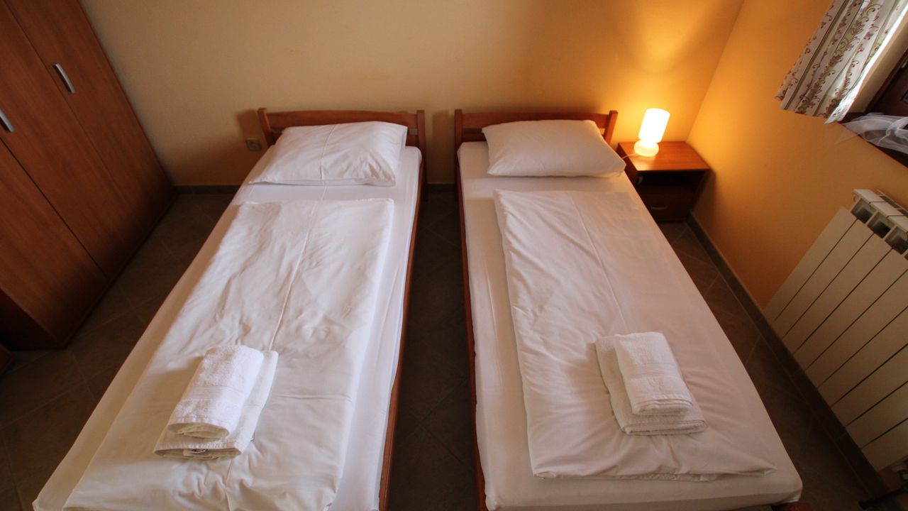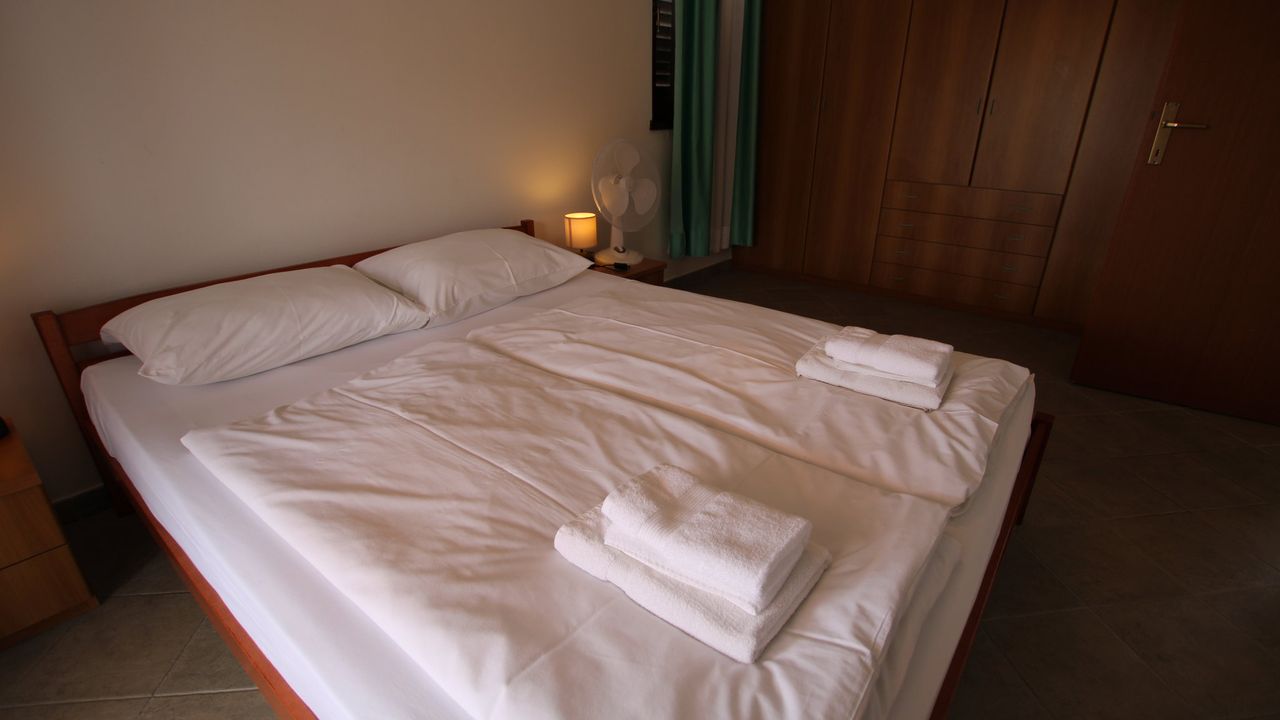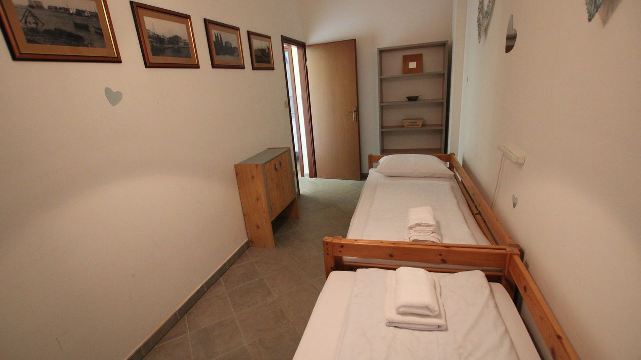 Ein Schlafzimmer hat ein Doppelbett und Zugang zum Balkon, den es sich mit dem zweiten Schlafzimmer teilt. Das zweite Schlafzimmer hat ein Doppelbett, das getrennt werden kann, und das dritte Schlafzimmer hat zwei Einzelbetten.