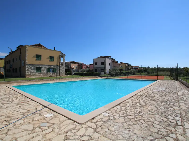 Apartment Tia bietet Platz für 4 Personen in zwei Schlafzimmern.Es befindet sich im ersten Stock und verfügt über einen Balkon mit Blick auf eine ruhige Gasse, einen Tennisplatz und einen Swimmingpool.