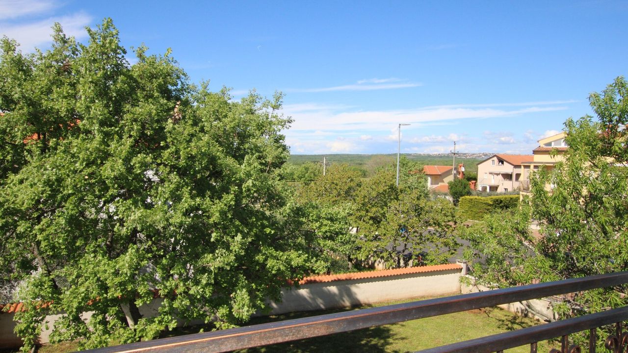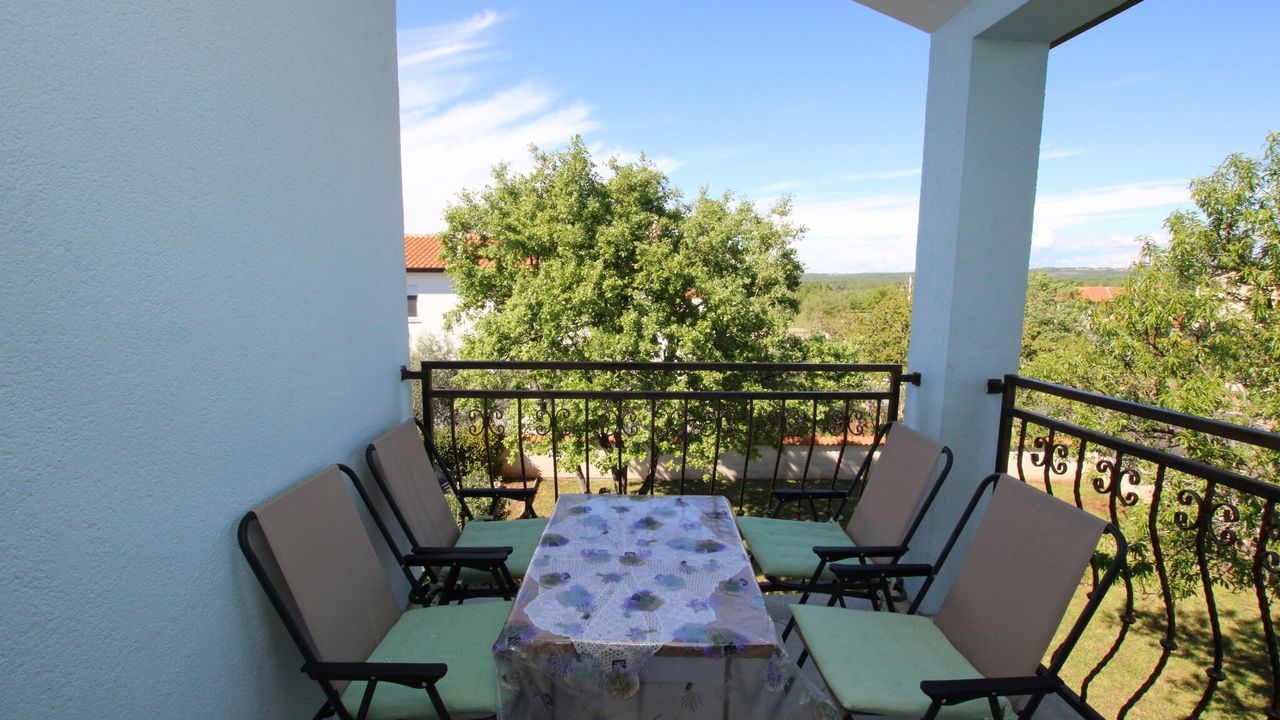Ein schöner überdachter Balkon mit Blick ins Grüne bietet Gemütlichkeit für die ganze Familie.
