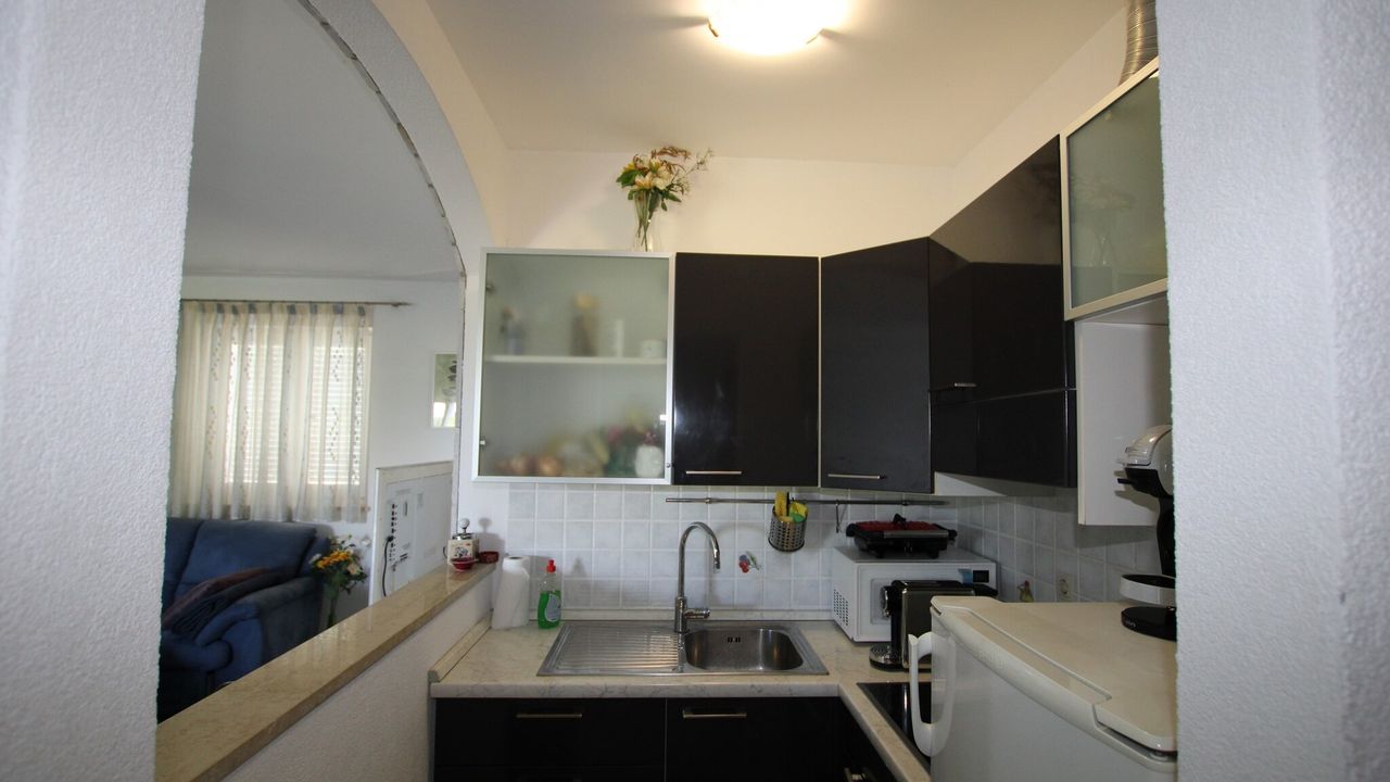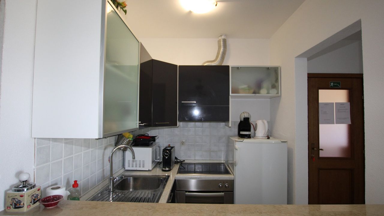 Die Küche ist mit 4 Kochplatten, Backofen, Mikrowelle, Kühlschrank mit Gefrierfach, Kaffeemaschine und Wasserkocher ausgestattet.