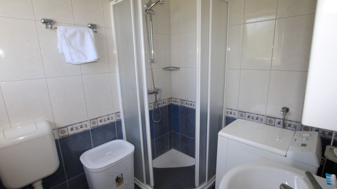 Das Badezimmer hat eine Waschmaschine, Dusche, WC und Waschbecken. Ein Bügeleisen und ein Bügelbrett sind vorhanden.