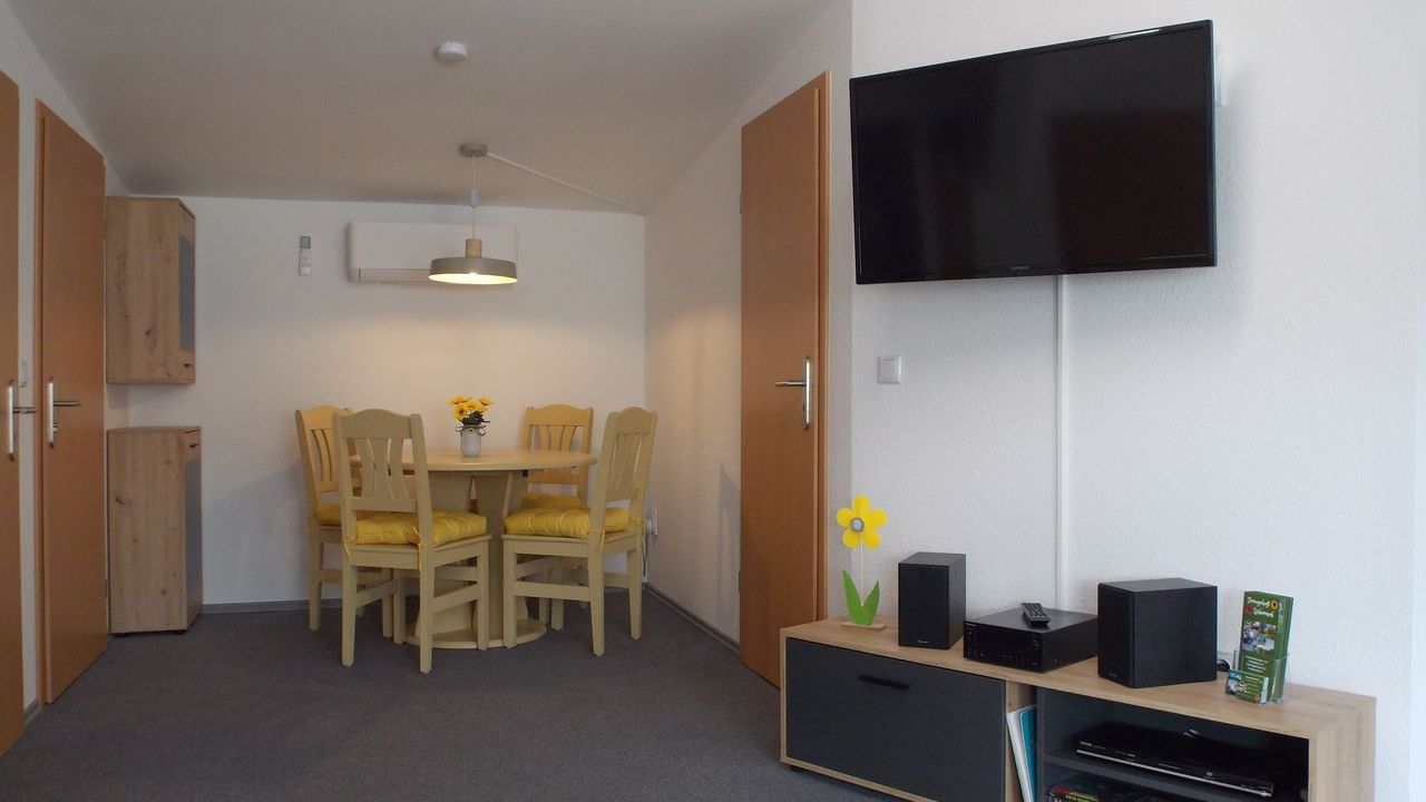 - Wohn-, Koch- und Essbereich mit Küchenzeile, Couch und Klimaanlage