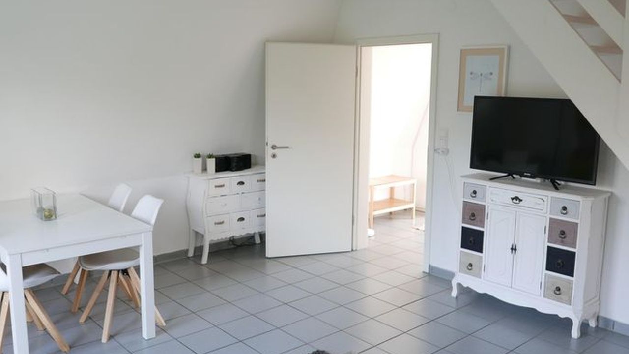 • Wohnbereich mit Fernseher, Schlafsofa und Esstisch