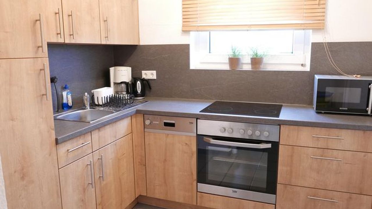 • Küche mit Elektroherd, Kühlschrank und Geschirrspüler, sowie einer Grundausstattung an Kochgeschirr und Besteck. Von der Küche abgehend eine Abstellkammer mit Waschmaschine.