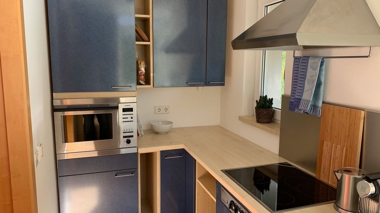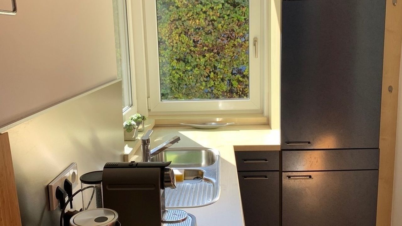Die moderne Küche ist ausgestattet mit einem Ceranfeld, Backofen Kühlschrank und Gefrierschrank. Eine Krups Nespresso Kapselmaschine mit Milchschäumer, Wasserkocher, Töpfe, Pfannen, Geschirr und eine Grundausstattung sind vorhanden.