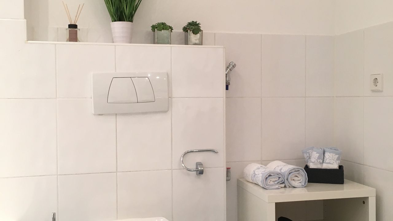 Das helle Bad hat eine separate Dusche und Badewanne und Waschmaschine, ein Föhn ist vorhanden.