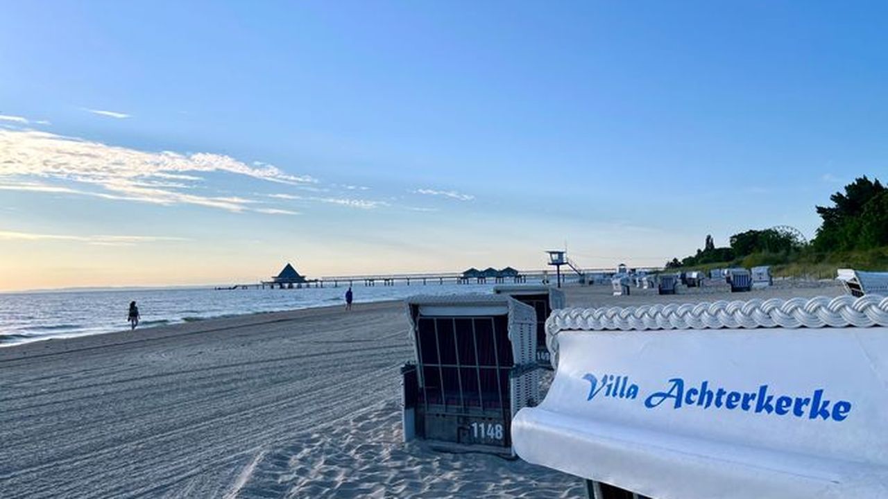 Auf dem Grundstück führt eine Treppe hinunter in den Kurpark und an den breiten, weißen Sandstrand. Hier bieten wir Ihnen von Mai bis September die Möglichkeit - noch vor Reiseantritt - einen unserer 4 Strandkörbe zu reservieren (70 €/Woche). Unser Strandabschnitt liegt etwas ruhiger, abseits vom quriligen Strandleben rund um die Seebrücke. Restaurants sowie Möglichkeiten zum Bummeln und Shoppen gibt es in der Kulmstraße und im wenige Schritte entfernten Ortszentrum.