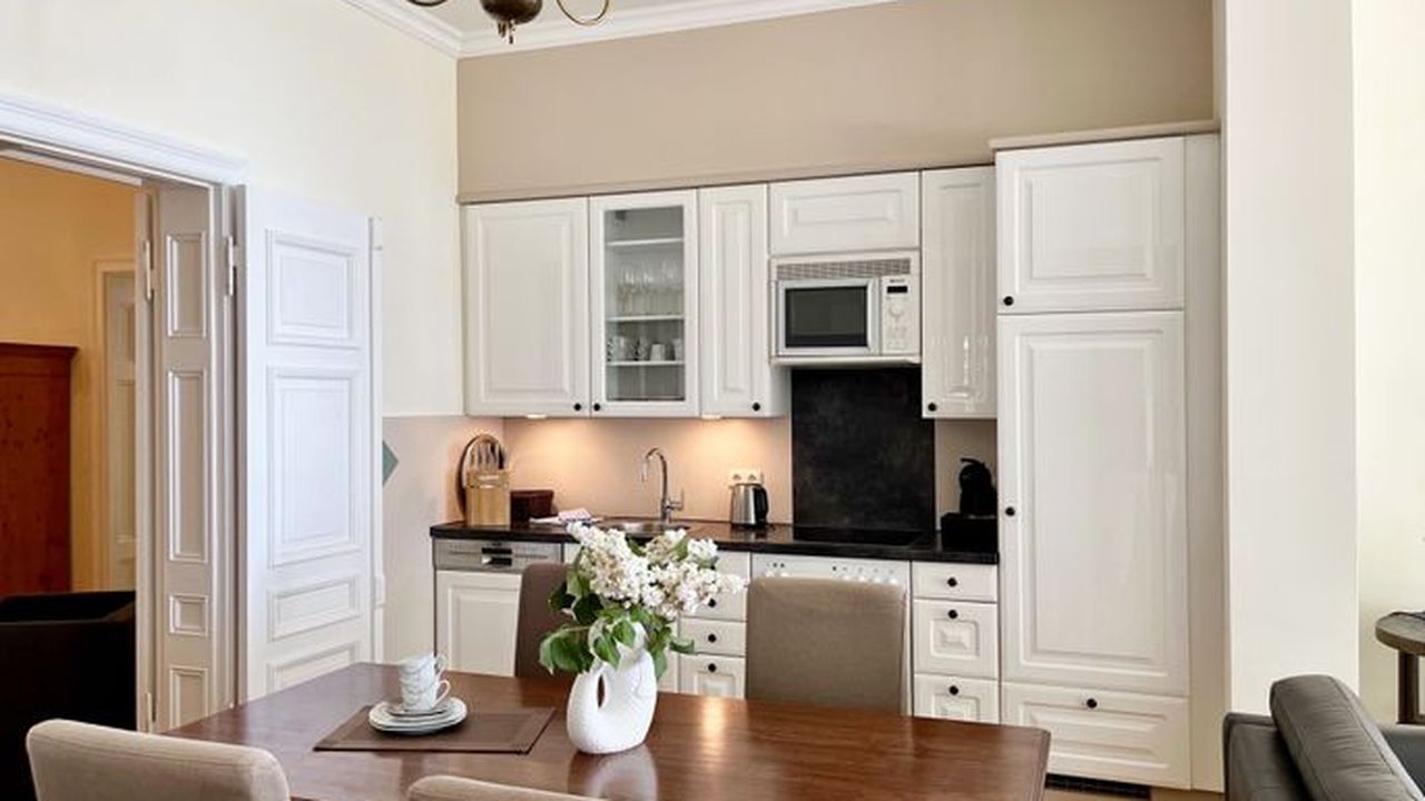 Auf jeder Etage gibt es jeweils in sich abgeschlossene, voll ausgestattete Küche (Kühlschrank mit Gefrierfach, Backofen, Cerankochfeld, Dunstabzug, Mikrowelle, Toaster, Wasserkocher, Filter-Kaffeemaschine u. Nespresso-Kapselmaschine, Rührgerät etc.). Zusätzlich steht in den meerseitigen Wohnbereichen eine weitere komplett ausgestattete Küchenzeile zur Verfügung.