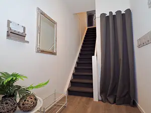 Am oberen Ende des Treppenaufganges befindet sich ein fest installiertes Treppengitter.