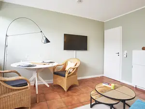 Diese Wohnung bietet eine ungewöhnliche Mischung: Mitten in Nieblum gelegen, aber in absoluter Ruhe, weil in zweiter Reihe fernab von Straßen, umringt nur von pittoresken Reetdachhäusern, aber nur wenige Schritte zum Dorfteich und 800 m vom Strand entfernt. Sie ist ca. 45 qm groß und bietet Platz für 2 Personen. Die Wohnung wurde 2022 umfangreich und mit viel Liebe zum Detail renoviert, neu möbliert und hochwertig ausgestattet. Die Wohnung hat einen besonderen maritimen Charme und gleichzeitig kluge, raumschaffende Lösungen, so dass sie hell, großzügig und gemütlich ist.