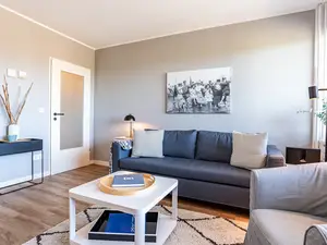 Im großzügigen Wohn- und Essbereich finden Sie eine voll ausgestattete, moderne Küchenzeile mit Induktionskochfeld, Backofen-Mikrowellen-Kombigerät, Nespresso-Kapselmaschine und weiteren technischen Geräten vor. Eine bequeme Sitzgelegenheit, ein 42" Smart-TV und eine Bose-Bluetooth-Box sorgen für Unterhaltung und Entspannung. Der zweite Balkon bietet einen Blick auf die Nordsee und lädt mit einem Lounge-Sessel zum Verweilen ein oder zum gemütlichen Frühstücken.