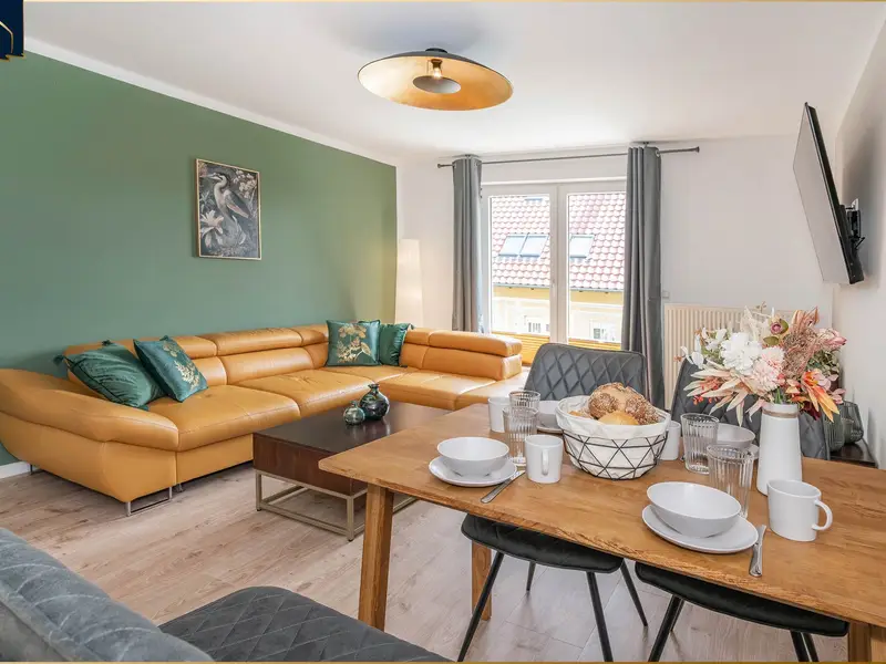 | Wohnzimmer | Offener Wohn- und Essbereich mit Sofa, großem Kabel-TV, Esstisch und Zugang zum Balkon. Helles Raumkonzept, ideal zum Entspannen oder Arbeiten. |