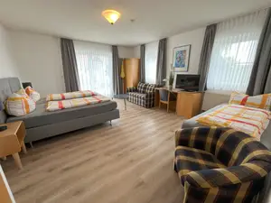 Im 1. Obergeschoss gelegen, besticht dieses ca. 42 m² große Apartment durch einen hellen Wohn-/Schlafraum mit Doppelbett und einem zusätzlichen Bett. Der Balkon zur Südseite bietet einen schönen Ausblick auf den Garten. Die moderne Wohnküche ist vollständig eingerichtet – u. a. mit Kaffeemaschine, Wasserkocher, Toaster, Backofen und Kühl-/Gefrierkombination. Das Tageslichtbad ist ausgestattet mit Dusche, WC und Haartrockner. Das Apartment ist rauchfrei, allergikerfreundlich und bietet kostenfreies WLAN, SAT-TV sowie einen Safe. Gemeinschaftliche Einrichtungen: Grillmöglichkeit, Spielgeräte für Kinder, Trampolin, Waschmaschine und Trockner sowie abschließbare Fahrradgarage mit Ladeplätzen für E-Bikes.Beschreibung der Unterkunft