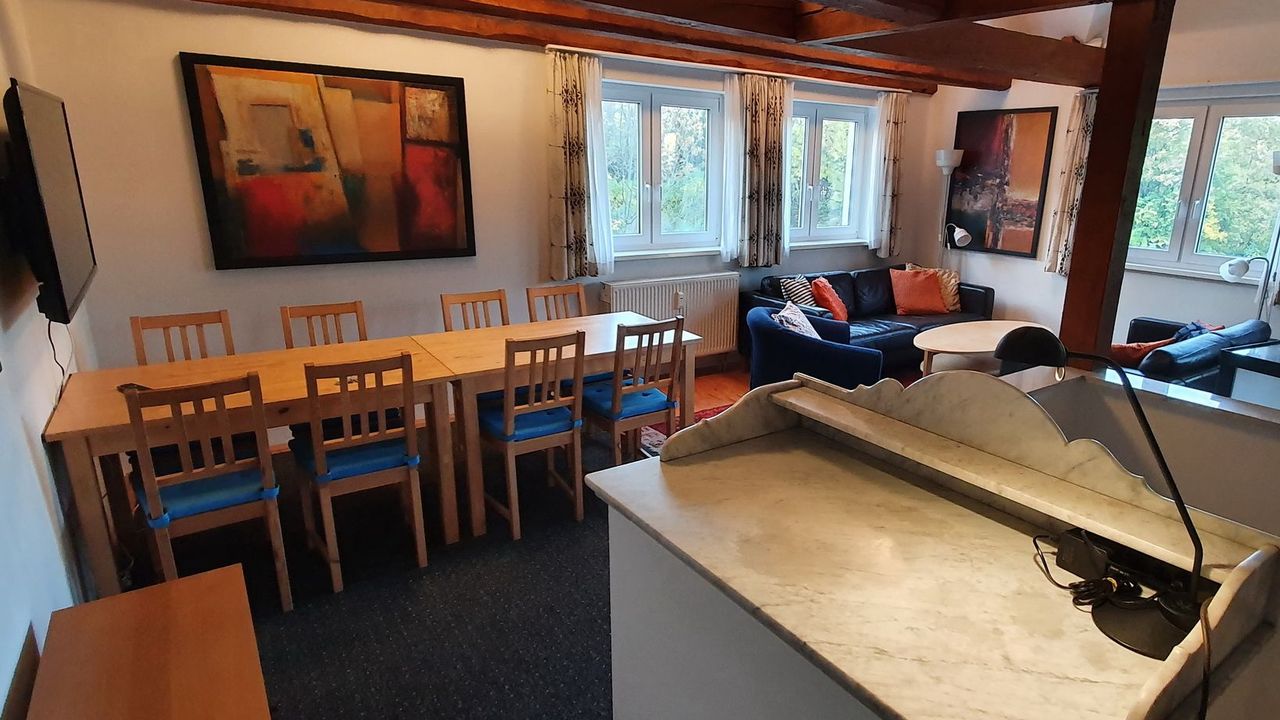 Große, ruhige Wohnung im Obergeschoss, 4-Raum Wohnung für 7 Personen, zentral im Unicampus gelegen. 2 Doppelbetten, 3 Einzelbetten. Flur mit Garderobe im EG. Im OG großzügiger offener Wohnraum mit großem Essbereich, Couchgruppe und Kaminofen. Offene Küche mit Küchentisch, Schlafzimmer mit 2 Einzelbetten und Schreibtisch, Schlafzimmer mit Doppelbett. Ein weiteres großes Schlafzimmer mit Doppelbett, Einzelbett, Couchgruppe, TV und Schreibtisch wird über eine kleine Treppe erreicht. Duschbad mit Tageslicht, Waschtisch, WC. TV, WiFi. Parkplätze können bei Bedarf gegen Gebühr mitgemietet werden. Zur gemeinschaftlichen Nutzung stehen den Gästen eine gemütliche Terrasse mit Gartenmöbeln, Fahrradunterstellplatz und eine Waschmaschine zur Verfügung.An-/Abreise ist ganzjährig an allen Wochentagen außer Weihnachten (24. bis 26. Dezember) und Silvester/Neujahr (31. Dezember bis 1. Januar) möglich. Nichtraucherwohnung. Haustiere (nur stubenrein, ungefährlich, leise) sind willkommen und können gegen Gebühr mitgebracht werden.