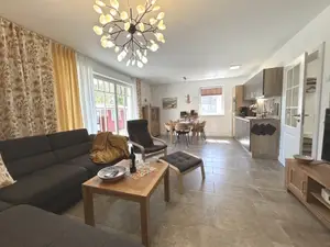 Neue, moderne 3-Zimmer-Ferienwohnung für 2-4 Personen im Erdgeschoss. Ostseebad Prerow, Waldstraße 64. Direkt am Darßwald, ca. 800 m zum Nordstrand, 5 min zum Zentrum, ruhig gelegen. 68 qm im Erdgeschoss. Terrasse und Garten, abschließbarer Fahrradraum, 2 Parkplätze. Modern und hochwertig eingerichtet, großzügiges Wohnzimmer mit großer Couch, Sessel, TV, Stereoanlage, Kamin, Esstisch, voll ausgestattete, Küchenzeile mit Spülmaschine, Backofen, Ceranfeld. Duschbad/WC und Gäste-WC. Waschmaschine.