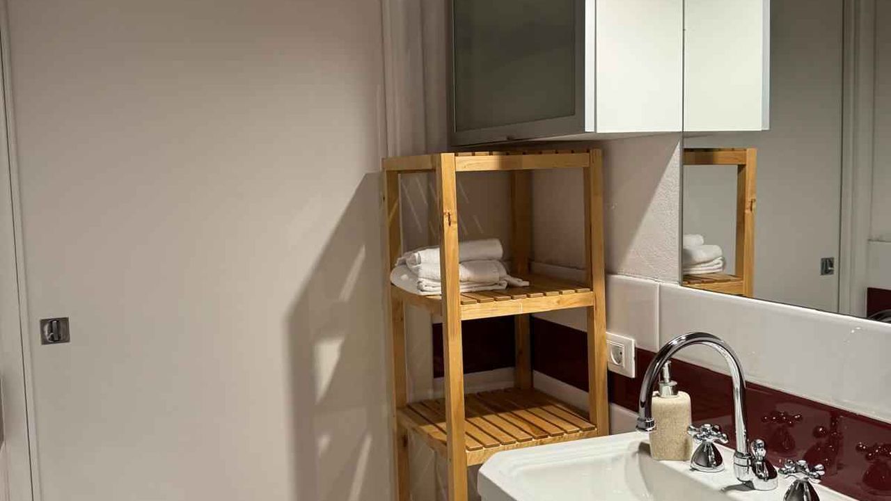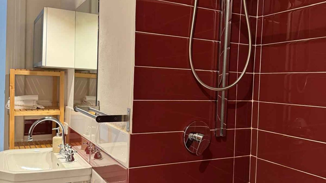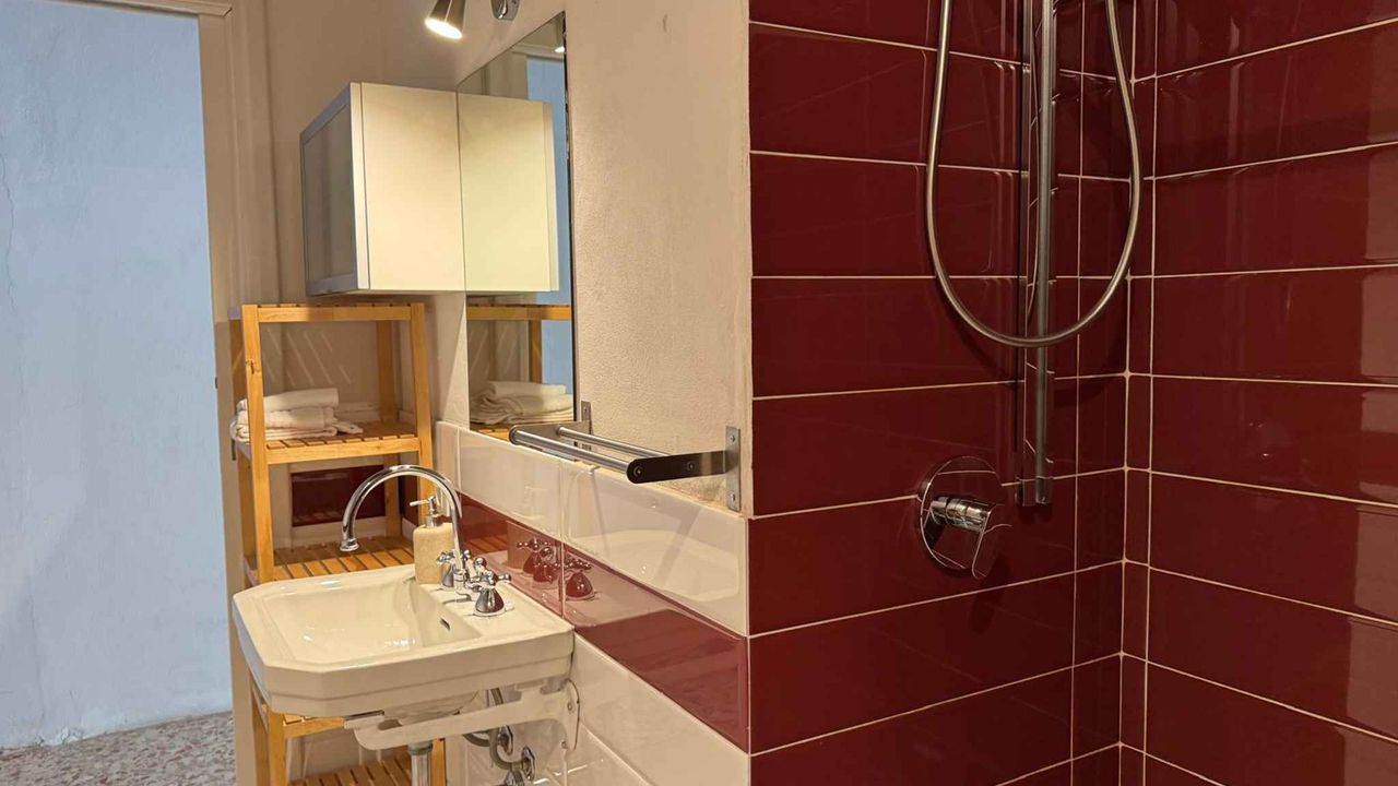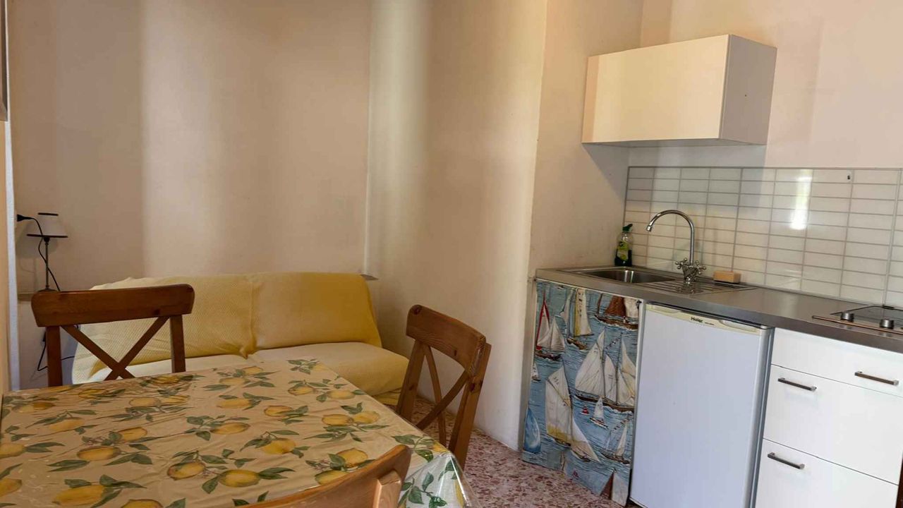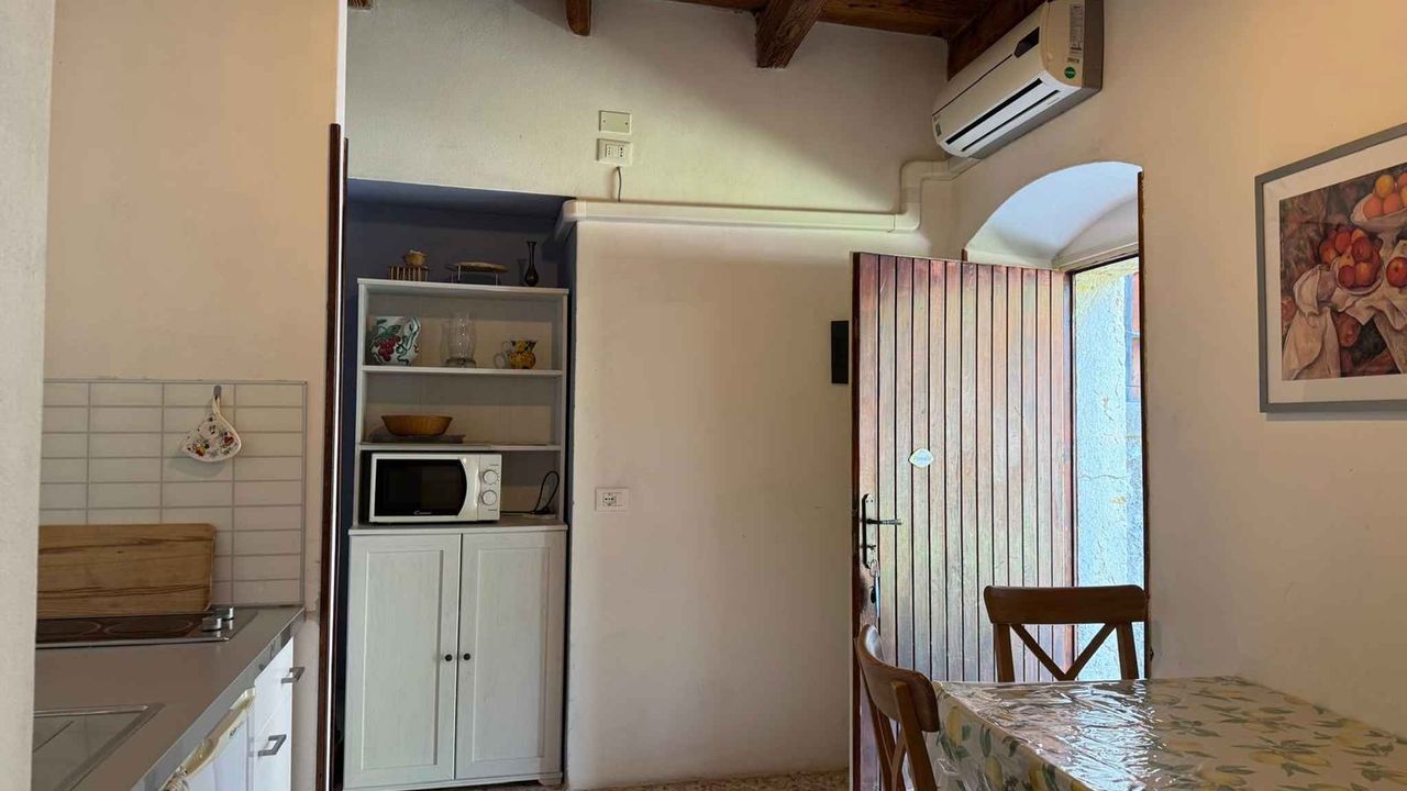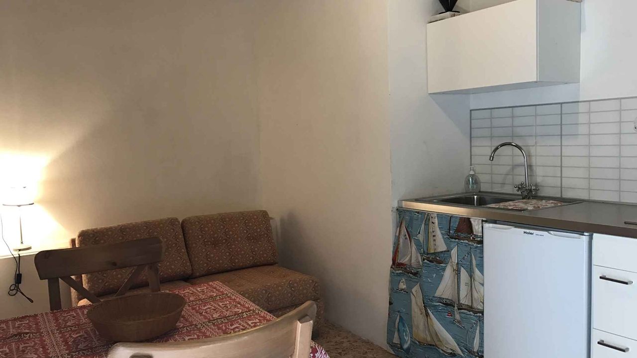 und führt über 10 Stufen direkt in die Wohnküche. die Wohnung ist eine Zwei-Zimmer-Wohnung mit Küche und Schlafzimmer mit Doppelbett. Wohnküche (Durchgangszimmer) mit TV und Essecke (2 Plätze). Schlafzimmer (12 qm) mit 1 Doppelbett (Kingsize), 1 Gitterbett und TV. Küche (9 qm) mit Elektroherd (Induktionsherd, 1 Platte), Kühlschrank, Mikrowelle und Kaffeemaschine. Bad (9 qm) mit Dusche, 1 Waschbecken, WC, Bidet, Föhn und Fenster.