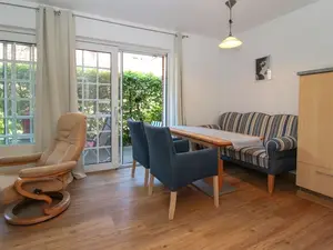 Die Küchenzeile wurde in den gemütlich eingerichteten Wohnbereich integriert. Von hier aus haben Sie über eine breite Schiebetür Zugang zur Südterrasse.