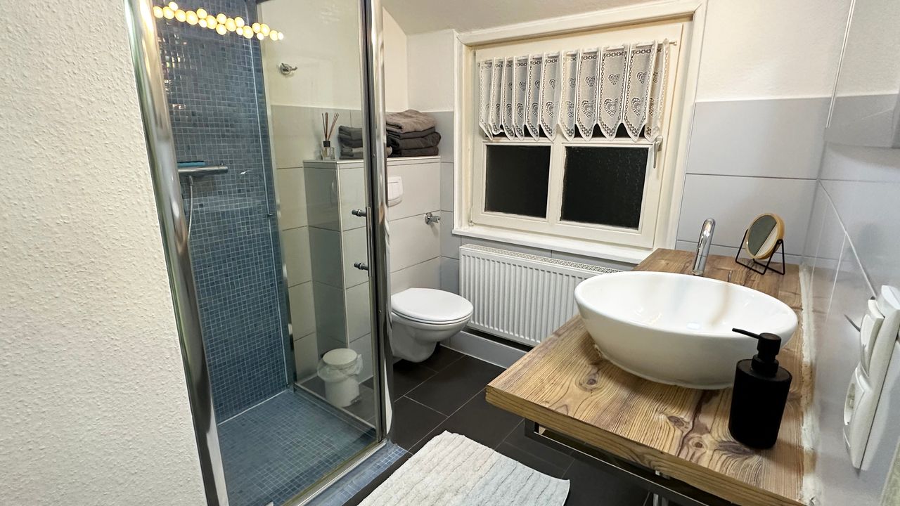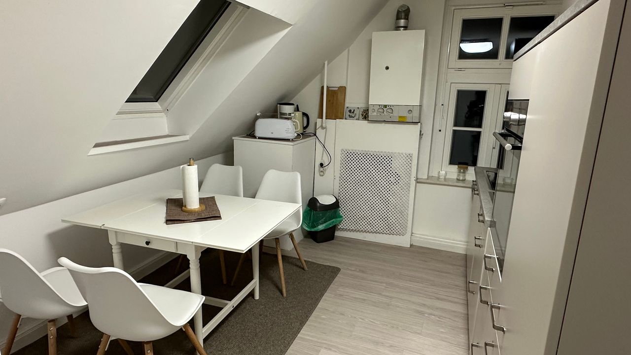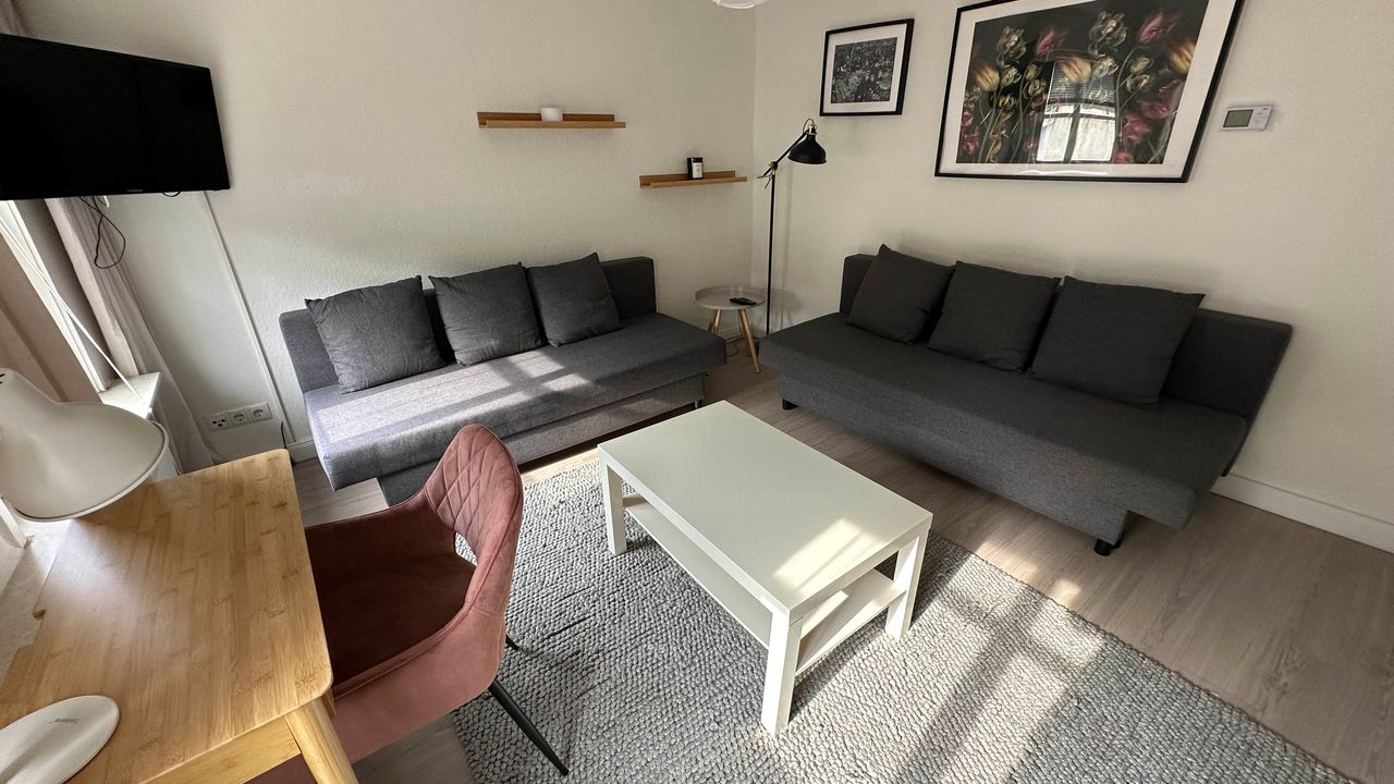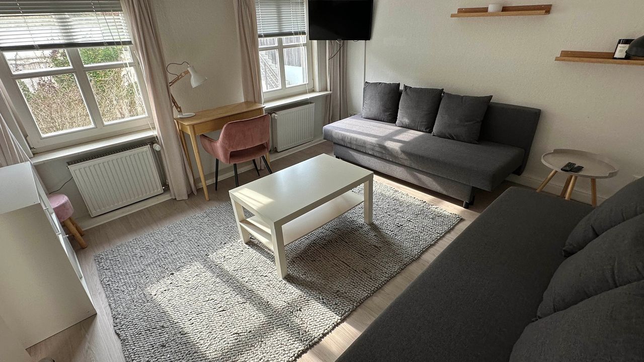 Die Wohnung Fledermaus befindet sich im Obergeschoss. Sie verfügt über ein Schlafzimmer mit Doppelbett (180 x 200), eine Küche, Duschbad und ein Wohnzimmer mit zwei Schlafsofas (ausgeklappt je 160 x 200). In einem Nebenraum des Schlafzimmers steht ein Babybett zur Verfügung.Die Küche ist voll ausgestattet mit Herd, Backofen, Kaffeemaschine, Geschirrspüler und Kühlschrank.