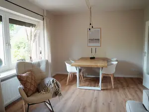 Zwei gemütliche Schlafzimmer bieten Platz für Familie oder Freunde. Die Einrichtung kombiniert warme Holztöne, Seefahrer-Details und Industrial-Elemente aus Metall. Die Küche ist komplett ausgestattet, das Bad modern gestaltet.