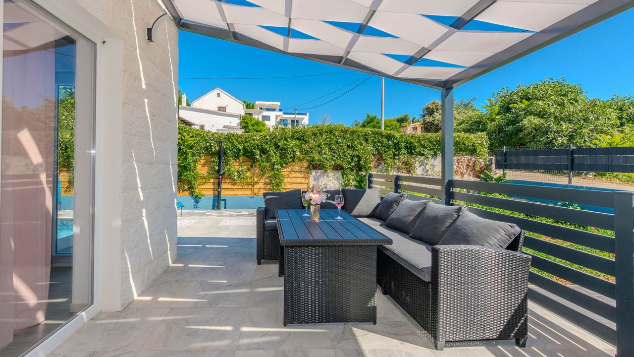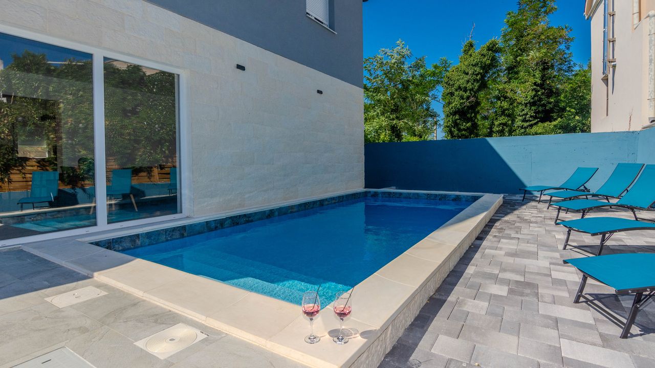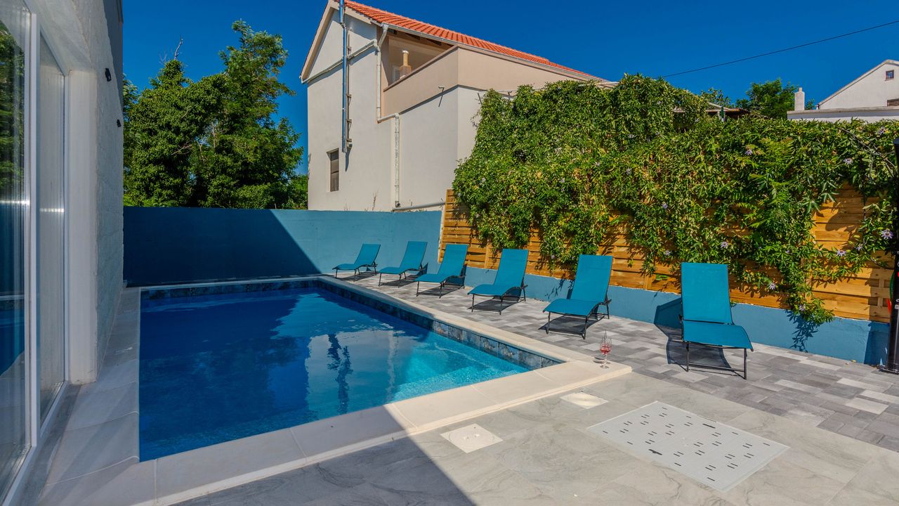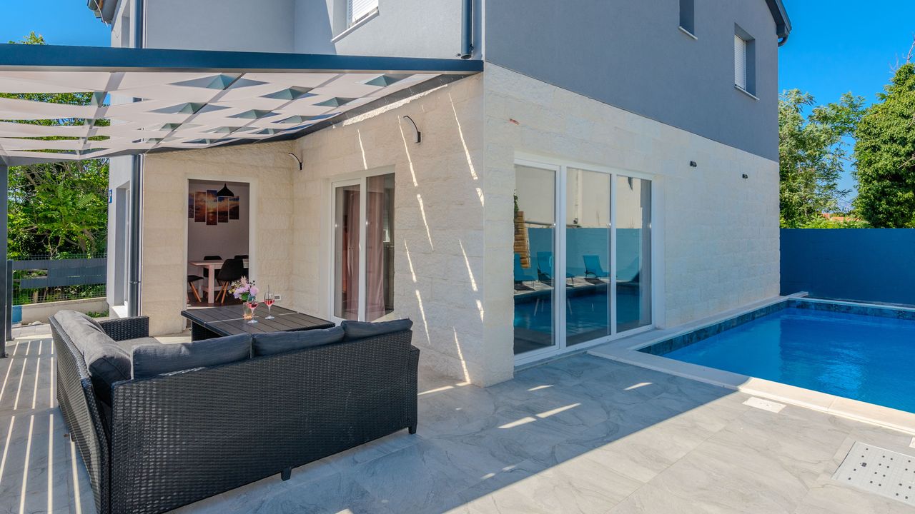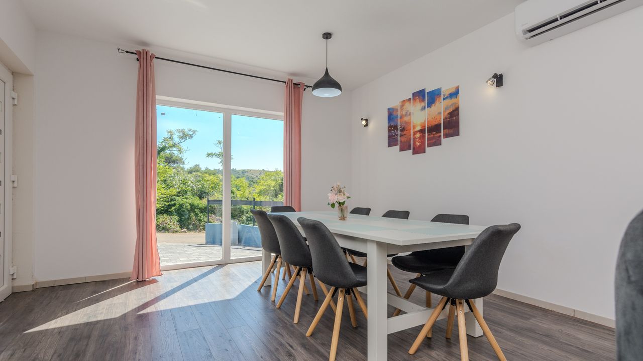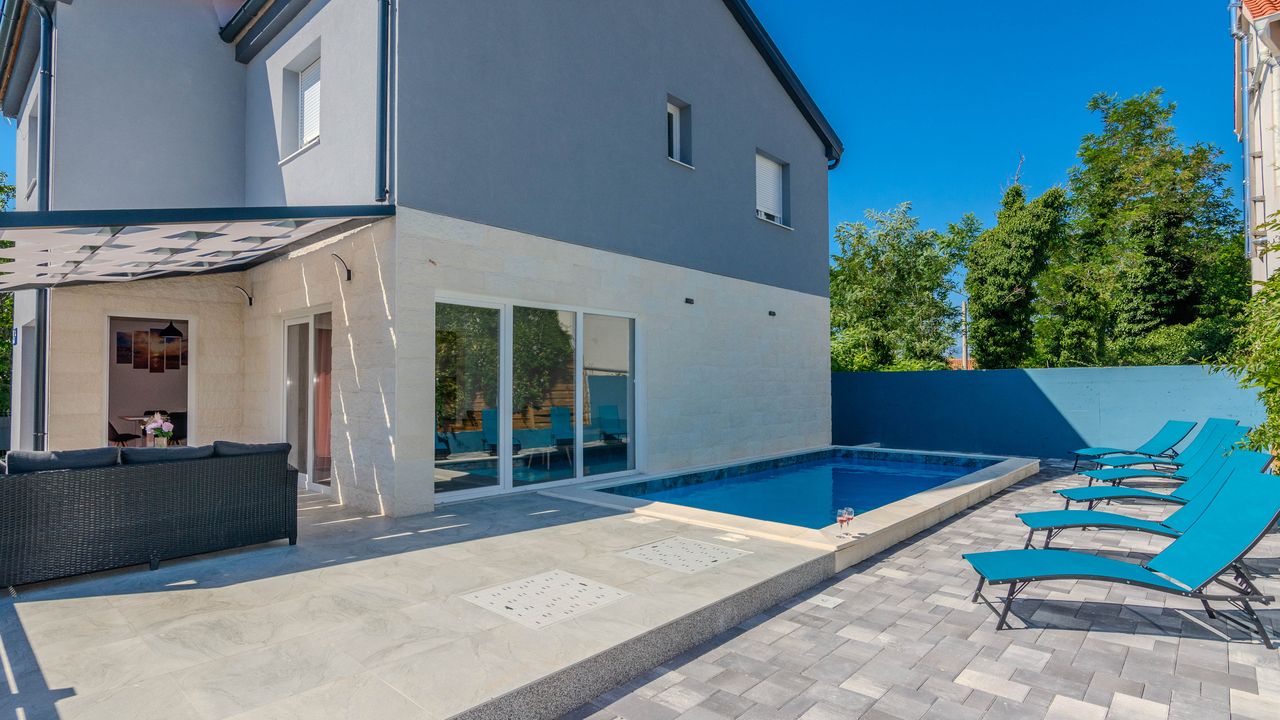 Diese moderne Villa mit Swimmingpool befindet sich in einer ruhigen Lage der Insel Vir namens Lozice. Die 140 m² Villa erstreckt sich über zwei Etagen und ist ideal für 10 Personen.Die Villa erstreckt sich über zwei Etagen und ist in ein Erdgeschoss mit einer voll ausgestatteten Küche, einem Esszimmer und einem Wohnzimmer sowie einem zusätzlichen Badezimmer mit Dusche aufgeteilt. Im Obergeschoss ist der Raum in vier Schlafzimmer aufgeteilt, zwei mit einem Doppelbett und einem eigenen Badezimmer mit Dusche, zwei Schlafzimmer mit zwei Einzelbetten und ein zusätzliches Badezimmer mit Dusche. Alle Zimmer sind klimatisiert. Zur Villa gehört eine überdachte Terrasse (30 m²), die mit Tisch und Stühlen ausgestattet ist. Der Innenhof der Villa (300 m²) verfügt über einen beheizten Swimmingpool und einen Entspannungsbereich mit Grill, Außendusche, Liegestühlen und Sonnenschirm.