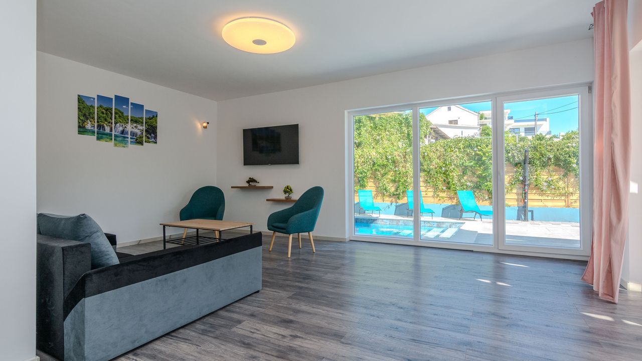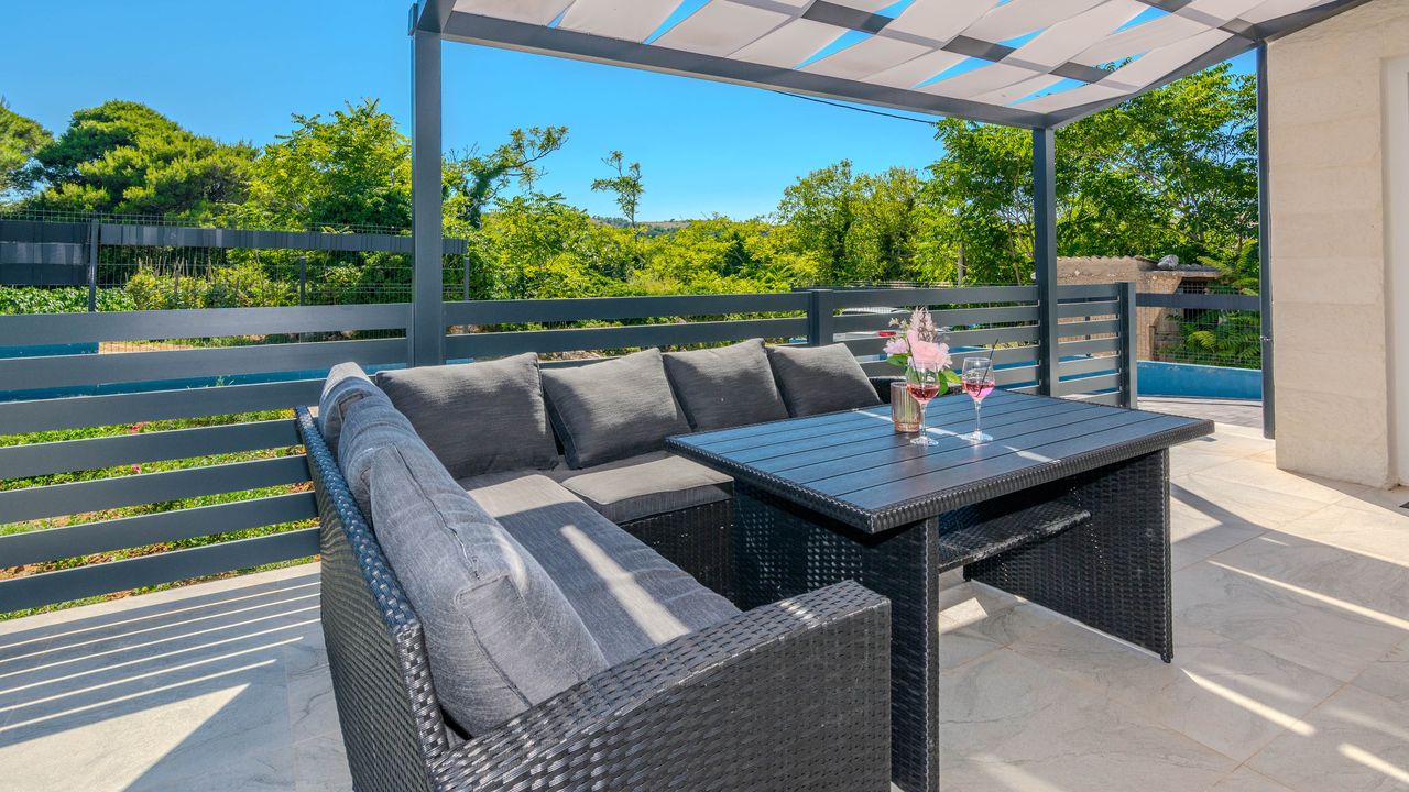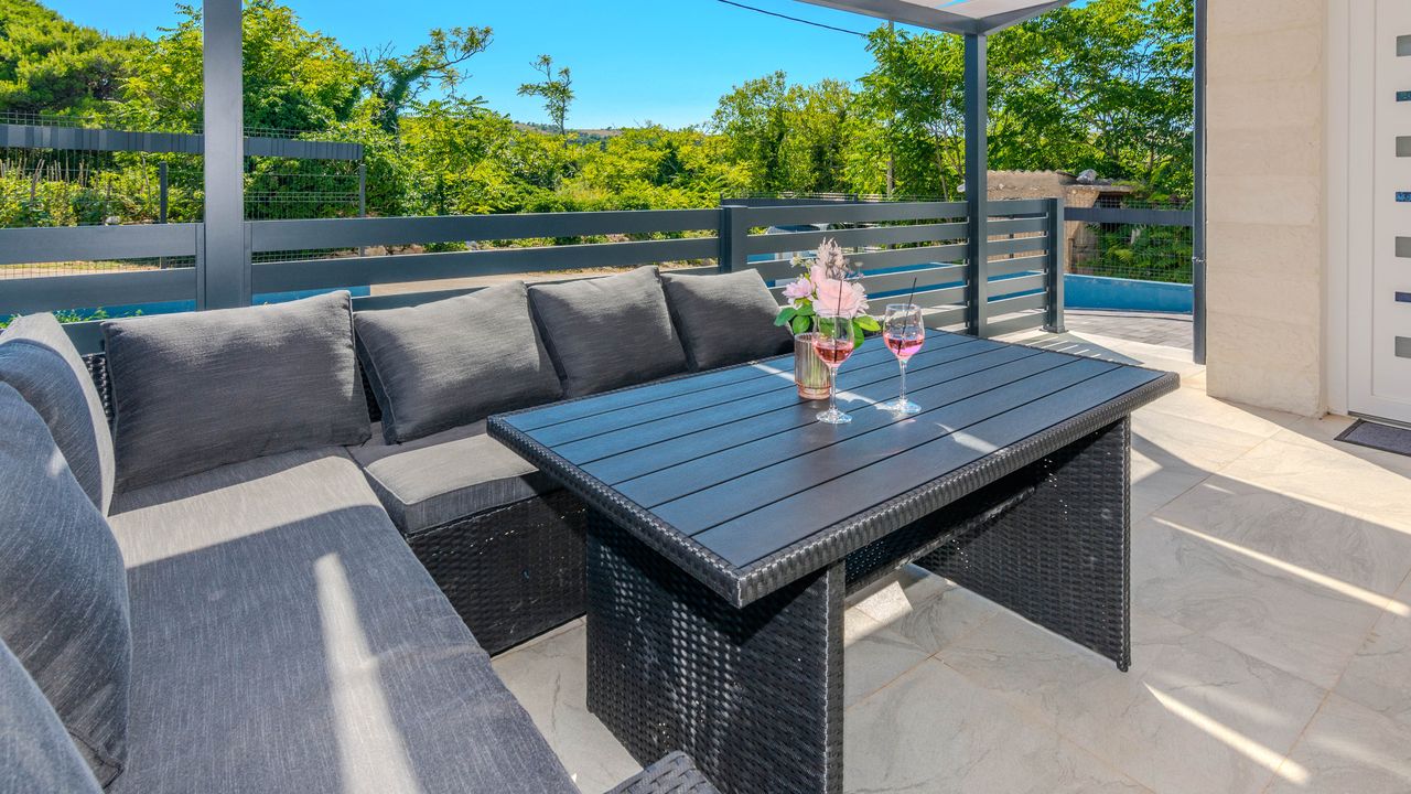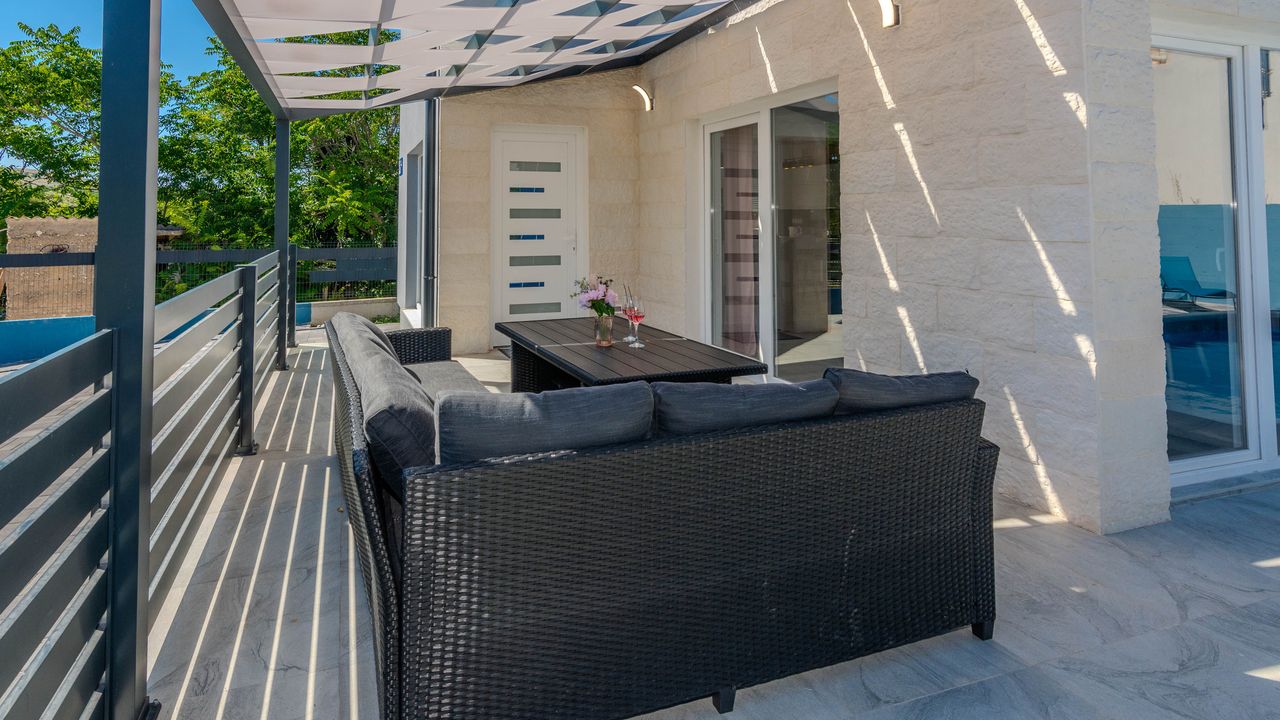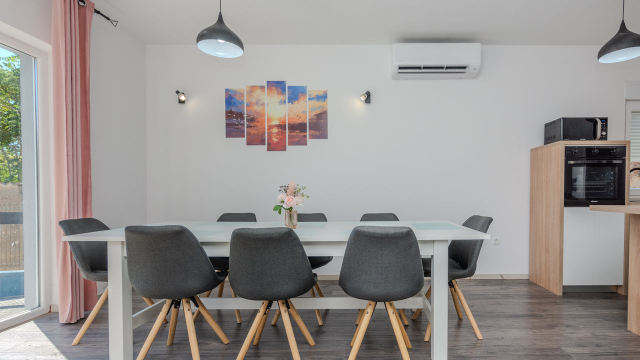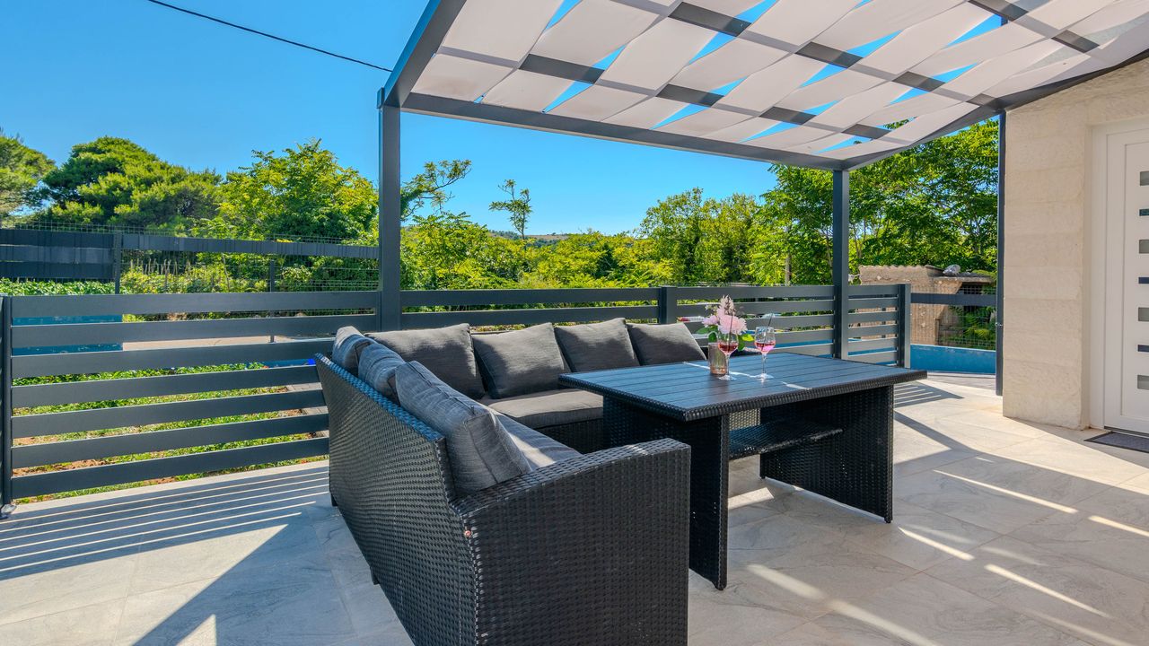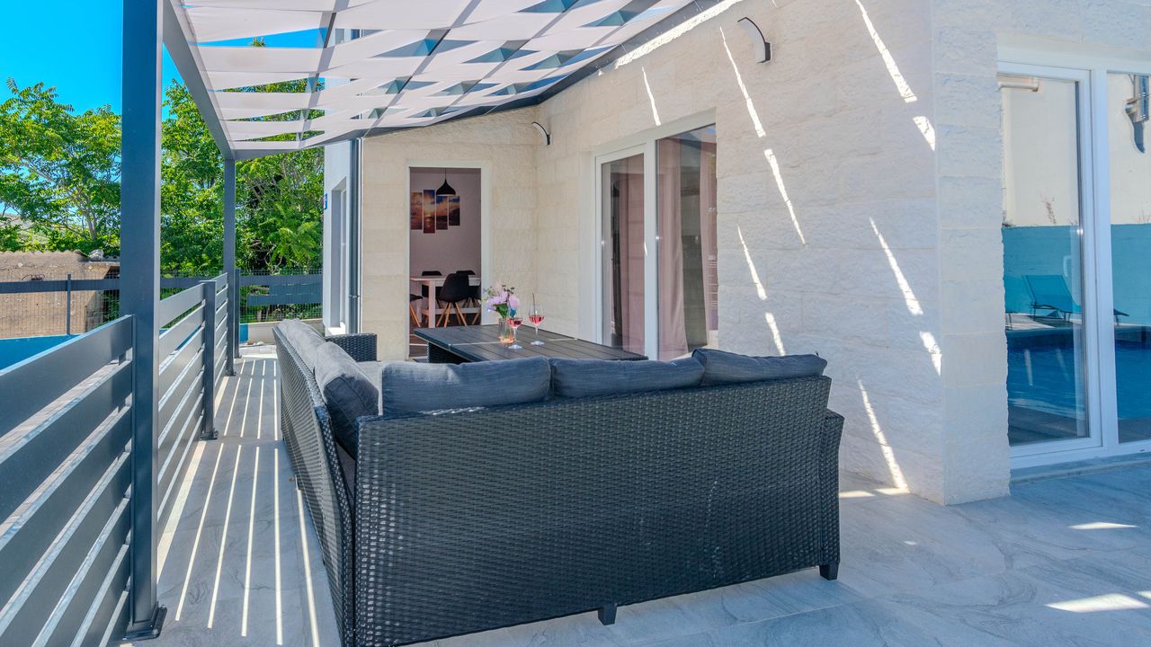 Diese moderne Villa mit Swimmingpool befindet sich in einer ruhigen Lage der Insel Vir namens Lozice. Die 140 m² Villa erstreckt sich über zwei Etagen und ist ideal für 10 Personen.Die Villa erstreckt sich über zwei Etagen und ist in ein Erdgeschoss mit einer voll ausgestatteten Küche, einem Esszimmer und einem Wohnzimmer sowie einem zusätzlichen Badezimmer mit Dusche aufgeteilt. Im Obergeschoss ist der Raum in vier Schlafzimmer aufgeteilt, zwei mit einem Doppelbett und einem eigenen Badezimmer mit Dusche, zwei Schlafzimmer mit zwei Einzelbetten und ein zusätzliches Badezimmer mit Dusche. Alle Zimmer sind klimatisiert. Zur Villa gehört eine überdachte Terrasse (30 m²), die mit Tisch und Stühlen ausgestattet ist. Der Innenhof der Villa (300 m²) verfügt über einen beheizten Swimmingpool und einen Entspannungsbereich mit Grill, Außendusche, Liegestühlen und Sonnenschirm.