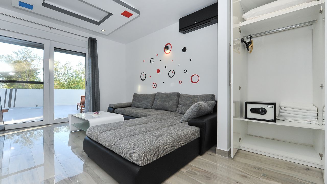 Der nächste Strand befindet sich in einer Entfernung von 300 m. Die Entfernung zum Supermarket beträgt 100 m und das nächste Restaurant ist 200 m von der Wohnung entfernt. Die Entfernung zum Privlaka Zentrum beträgt 2000 m.