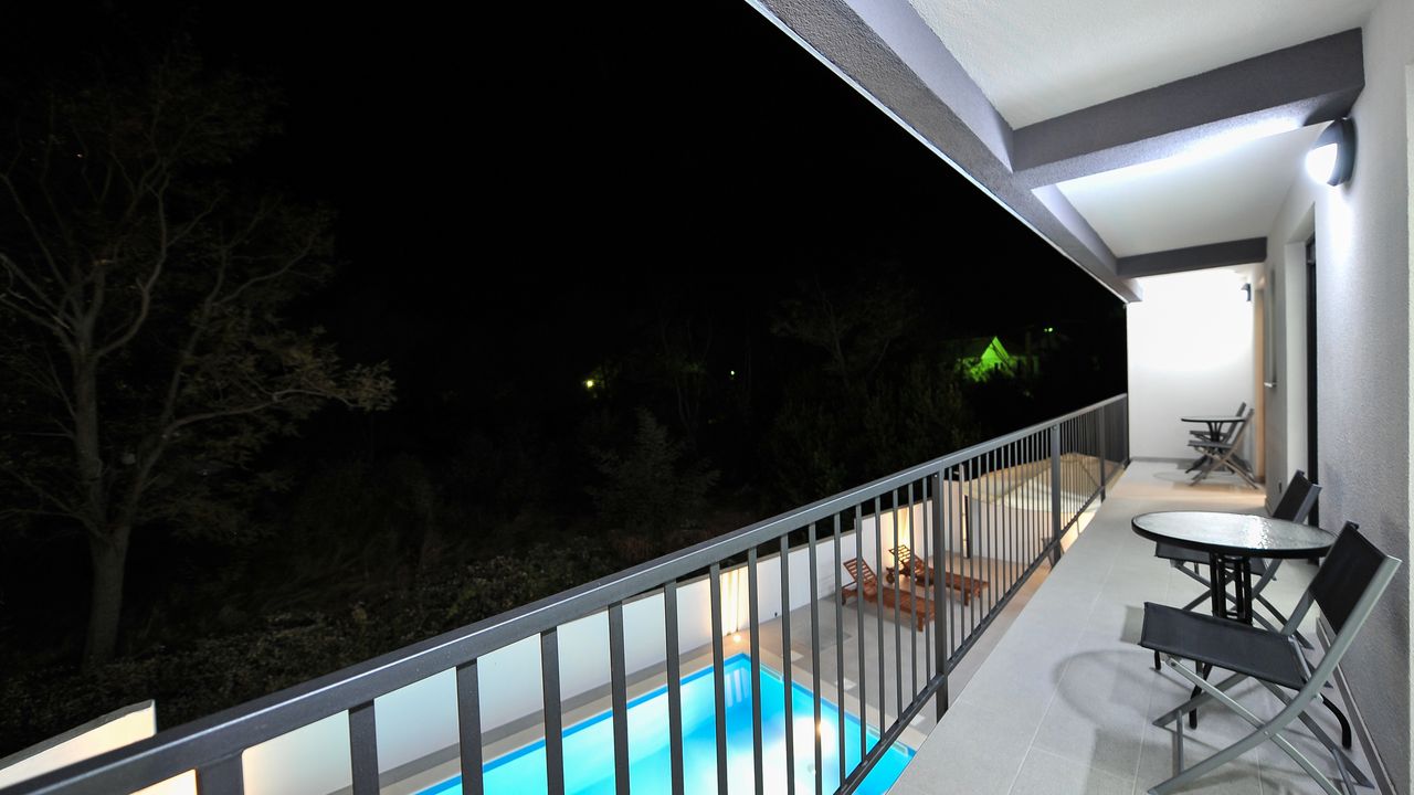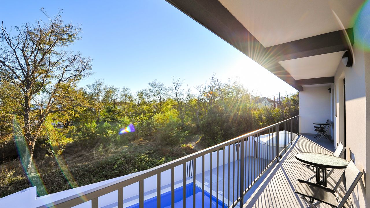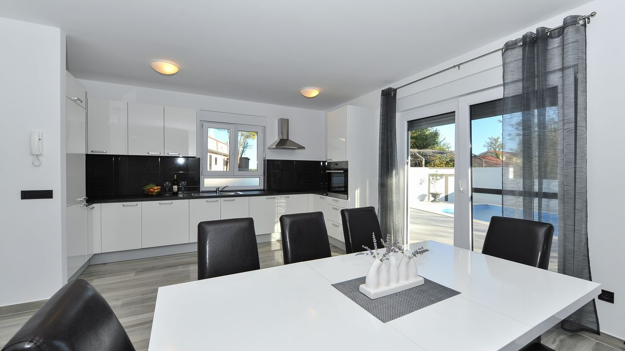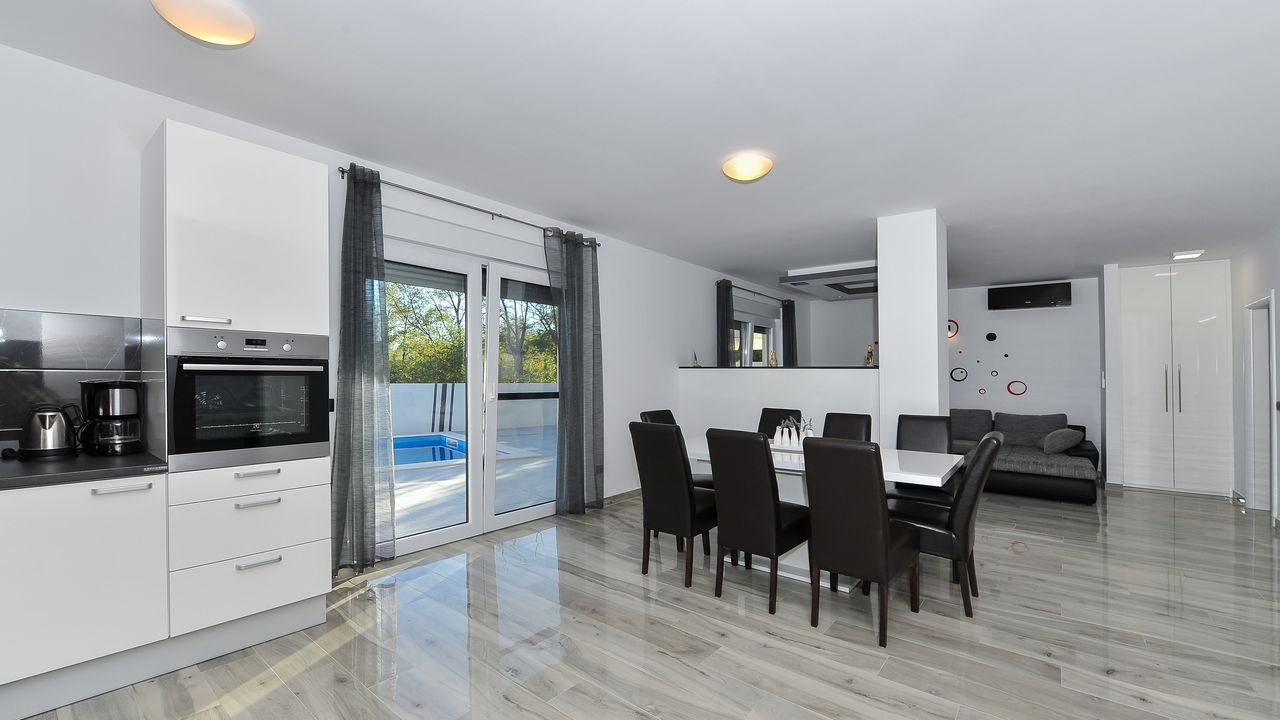 Diese moderne Villa mit Swimmingpool befindet sich in einer ruhigen Gegend der Gemeinde Privlaka. Die 150 m² Villa erstreckt sich über zwei Etagen und ist ideal für 8 Personen.Die Villa erstreckt sich über zwei Etagen und ist in ein Erdgeschoss mit einer voll ausgestatteten Küche, einem Esszimmer und einem Wohnzimmer sowie einem zusätzlichen Badezimmer mit Dusche aufgeteilt. Im Obergeschoss ist der Raum in drei Schlafzimmer aufgeteilt mit einem Doppelbett und einem eigenen Badezimmer mit Dusche, Jedes Zimmer ist klimatisiert und verfügt über Sat-TV. Alle Zimmer haben Zugang zu einem gemeinsamen Balkon (10 m²), der mit einem Tisch und Stühlen ausgestattet ist. Der Innenhof des Anwesens (200 m²) verfügt über einen beheizten Swimmingpool und einen Pavillon, die mit einer Sommerküche, einem Grill, einer Außendusche, Liegestühlen, einem Sonnenschirm, einem Tisch und Stühlen ausgestattet ist.
