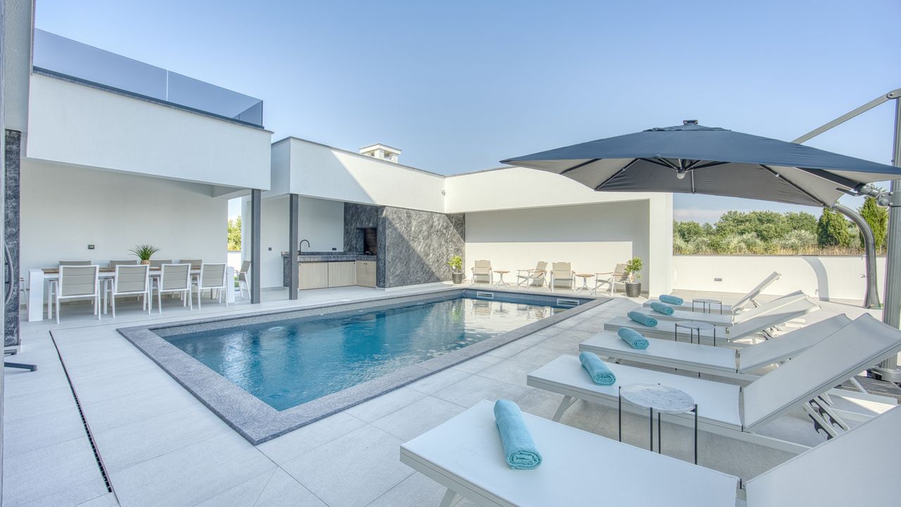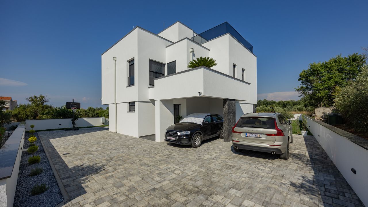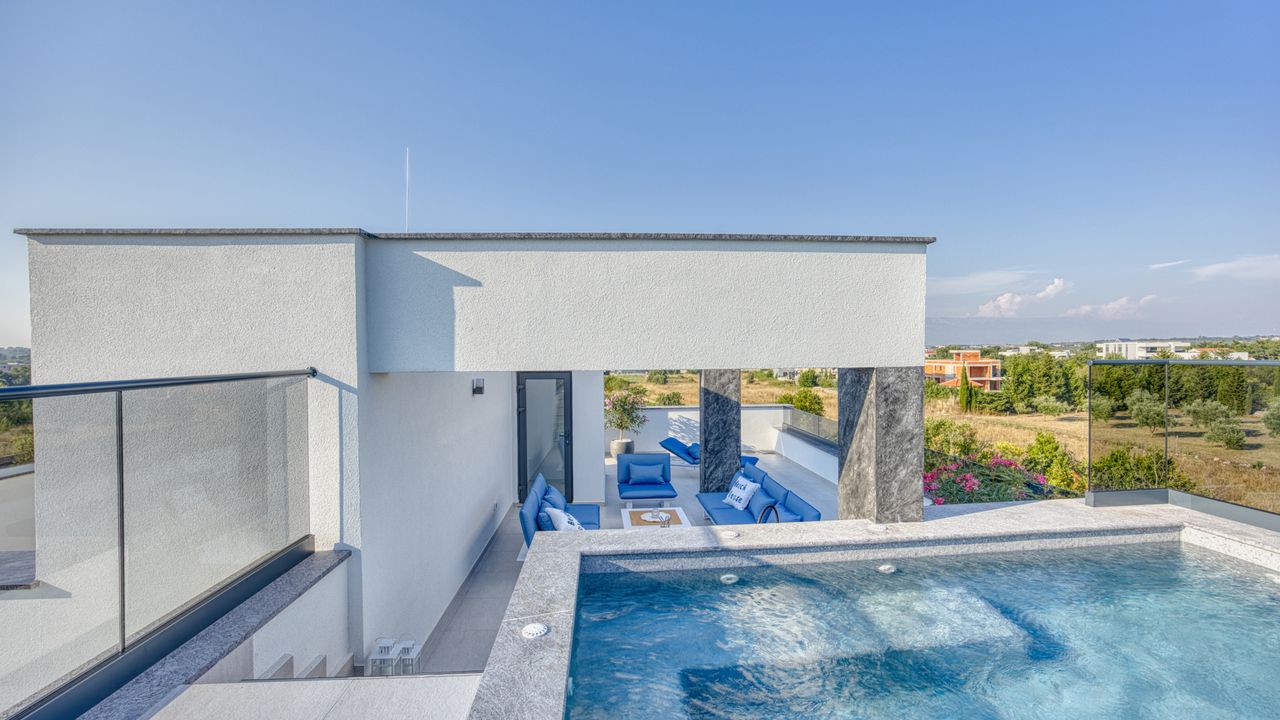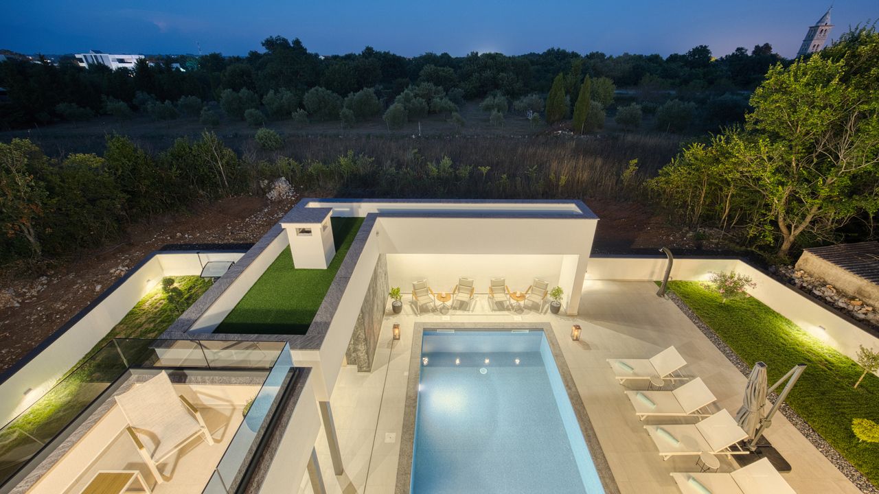 Diese luxuriöse und moderne Villa befindet sich auf einem 600 m² großen Anwesen mit Swimmingpool in einer ruhigen Ortsteil Zaton und ist ideal für 8-10 Personen.Im Erdgeschoss befindet sich ein stilvolles Wohnzimmer mit Poolblick, Esszimmer und voll ausgestattete Küche. Im ersten Stock der Villa befinden sich 4 Schlafzimmern mit Doppelbetten. Jedes Schlafzimmer ist mit Sat-TV, Safe, Klimaanlage und einem Badezimmer mit Dusche ausgestattet. Im Erdgeschoss befindet sich eine separate Toilette. Ebenfalls im zweiten Stock können die Gäste der Villa einen Mini-Wellnessbereich mit Sauna nutzen. Zur Villa gehören eine Dachterrasse mit Swimmingpool und Meerblick sowie ein Sonnendeck mit Liegestühlen, Sitzbereich und Außenküche.
