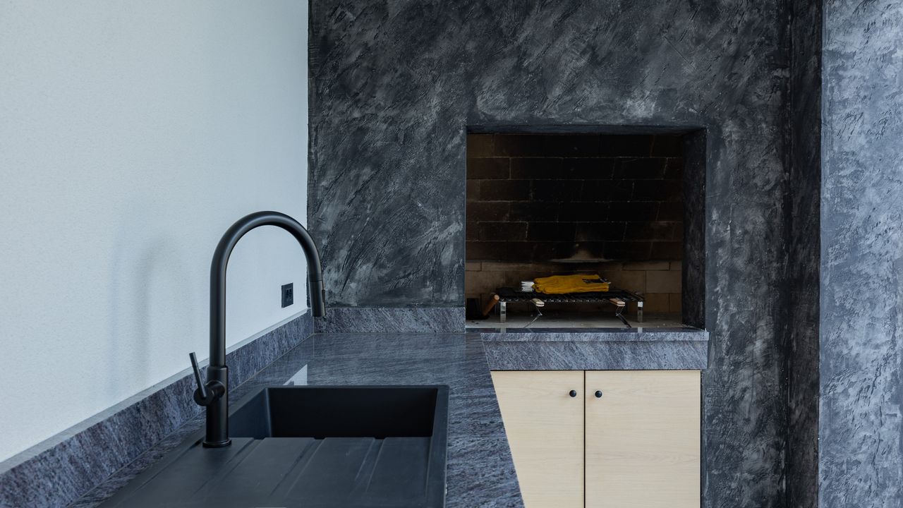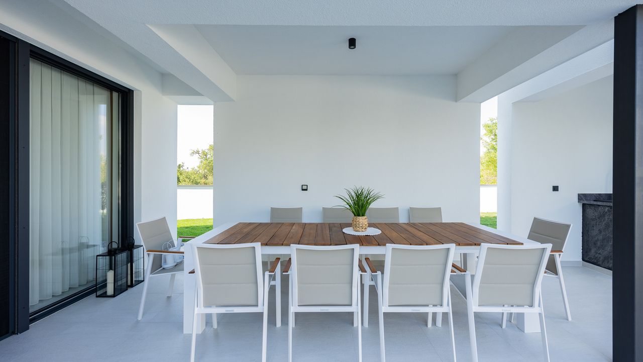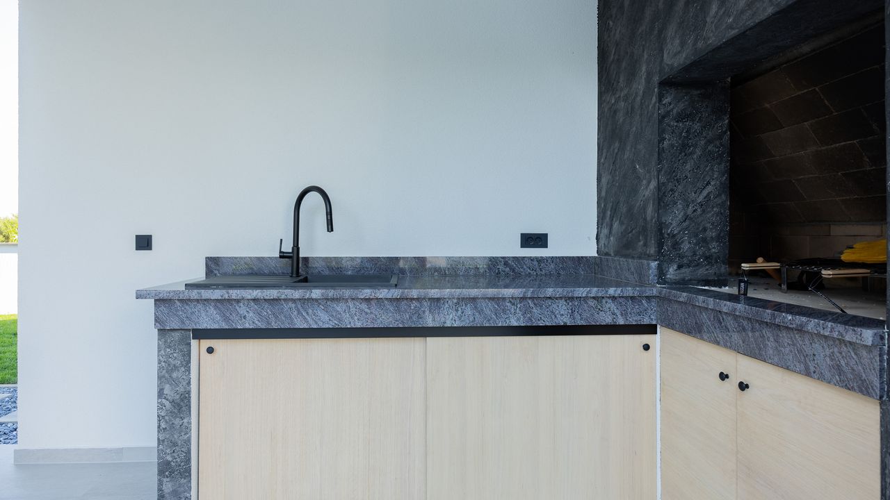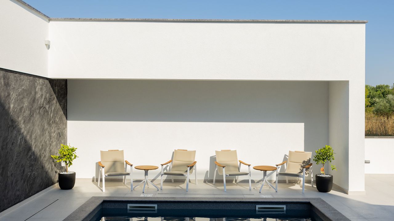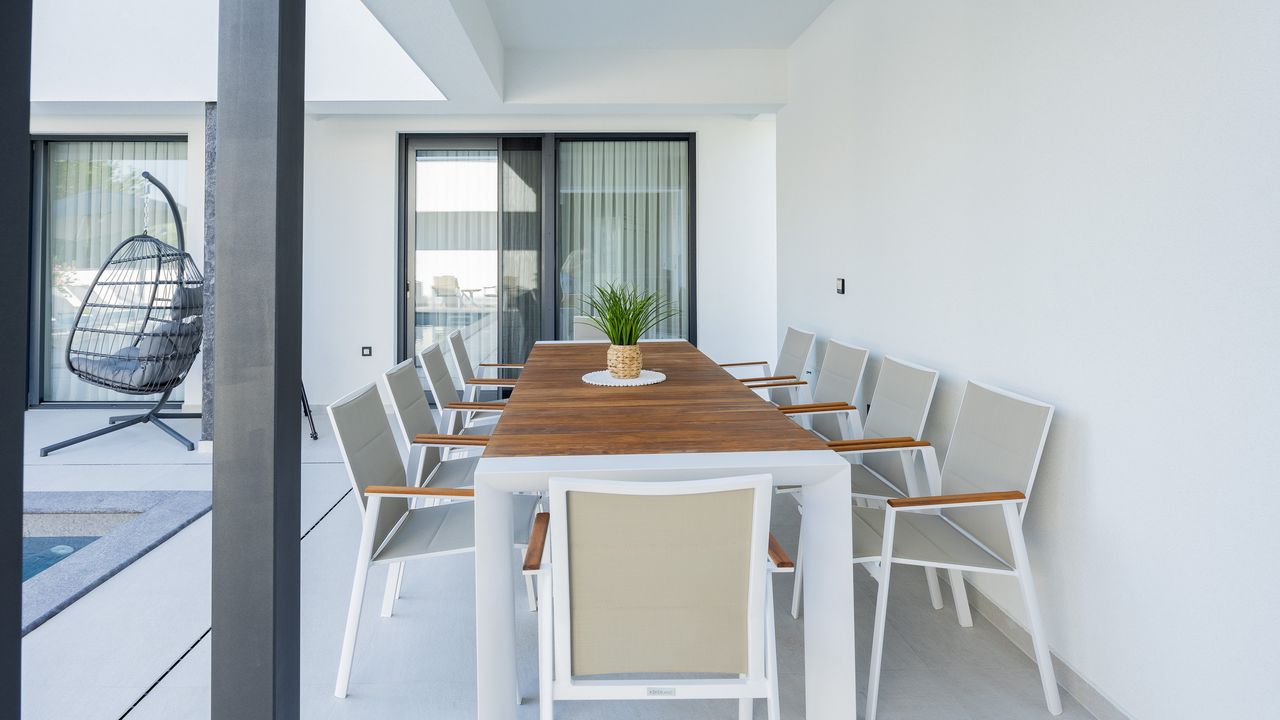 Terrasse im Erdgeschoss 55 m² teilt sich auf eine voll ausgestattete Außenküche, Grill, Esszimmer für 10 Personen und Zugang zu einem einzigartigen beheizter 8 Meter langen Swimmingpool. Bei dem Pool erstrecken sich Liegestühle und Außendusche.