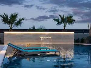 Terrasse im Erdgeschoss 67 m² teilt sich auf eine voll ausgestattete Außenküche, Grill, Esszimmer für 12 Personen, und verfügt über Zugang zu einem einzigartigen Pool, 13 Meter lang (84,5 m²) mit integriertem Poolliegen im flachen Teil des Pools ideal für Kinder. Bei dem Pool erstrecken sich Liegestühle und Außendusche.