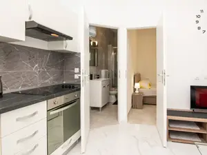 Diese Studio Wohnung im ersten Stock ist ideal für 2 Personen. Es befindet sich in einer ruhigen Lage der Insel Vir namens Radnjača.Das Apartment ist aufgeteilt in ein Wohnzimmer, eine voll ausgestattete Küche, Schlafzimmer mit Doppelbett und ein Badezimmer mit Dusche. Zur Wohnung gehört eine 20 m² überdachte große Balkon mit teilweisem Meerblick, Tisch und Stühlen.