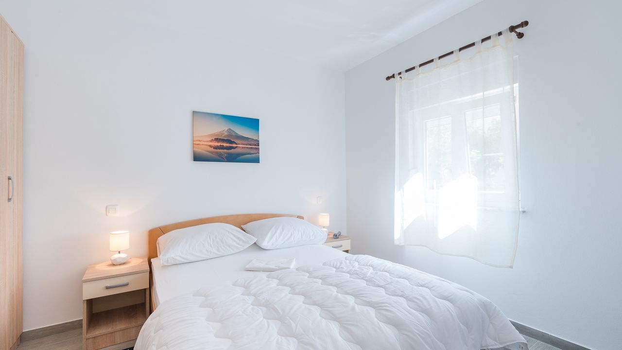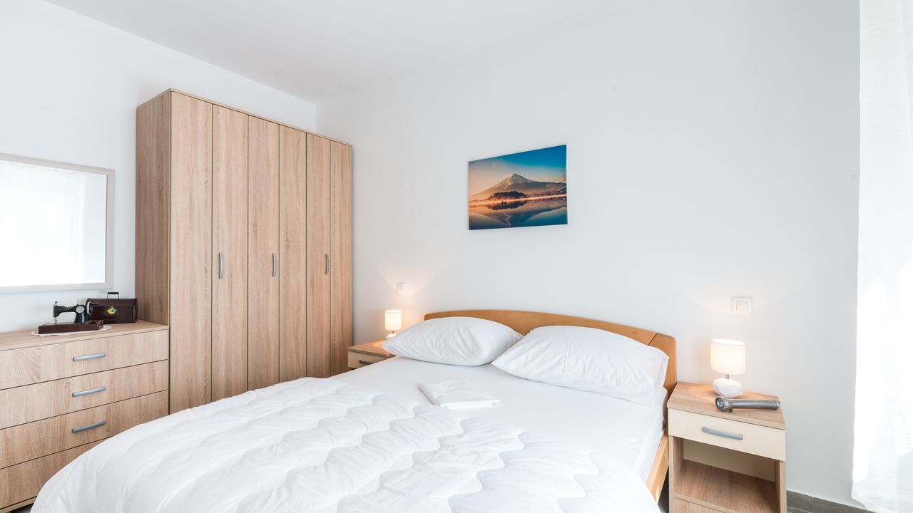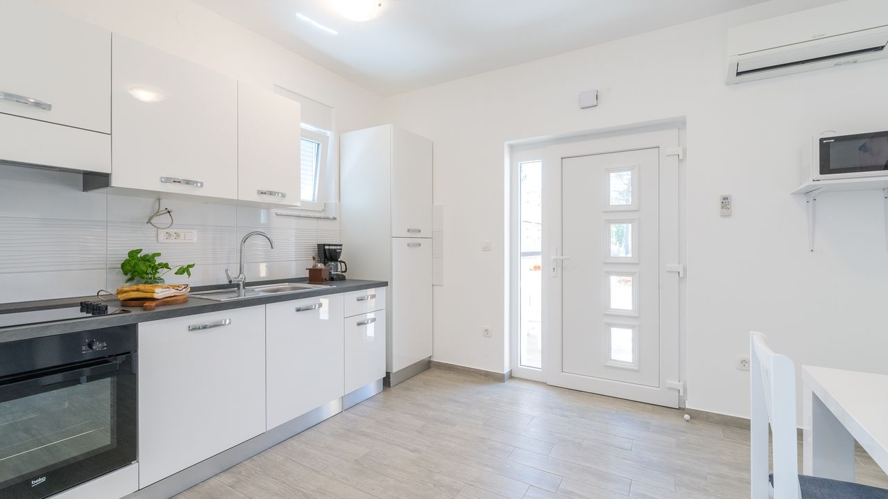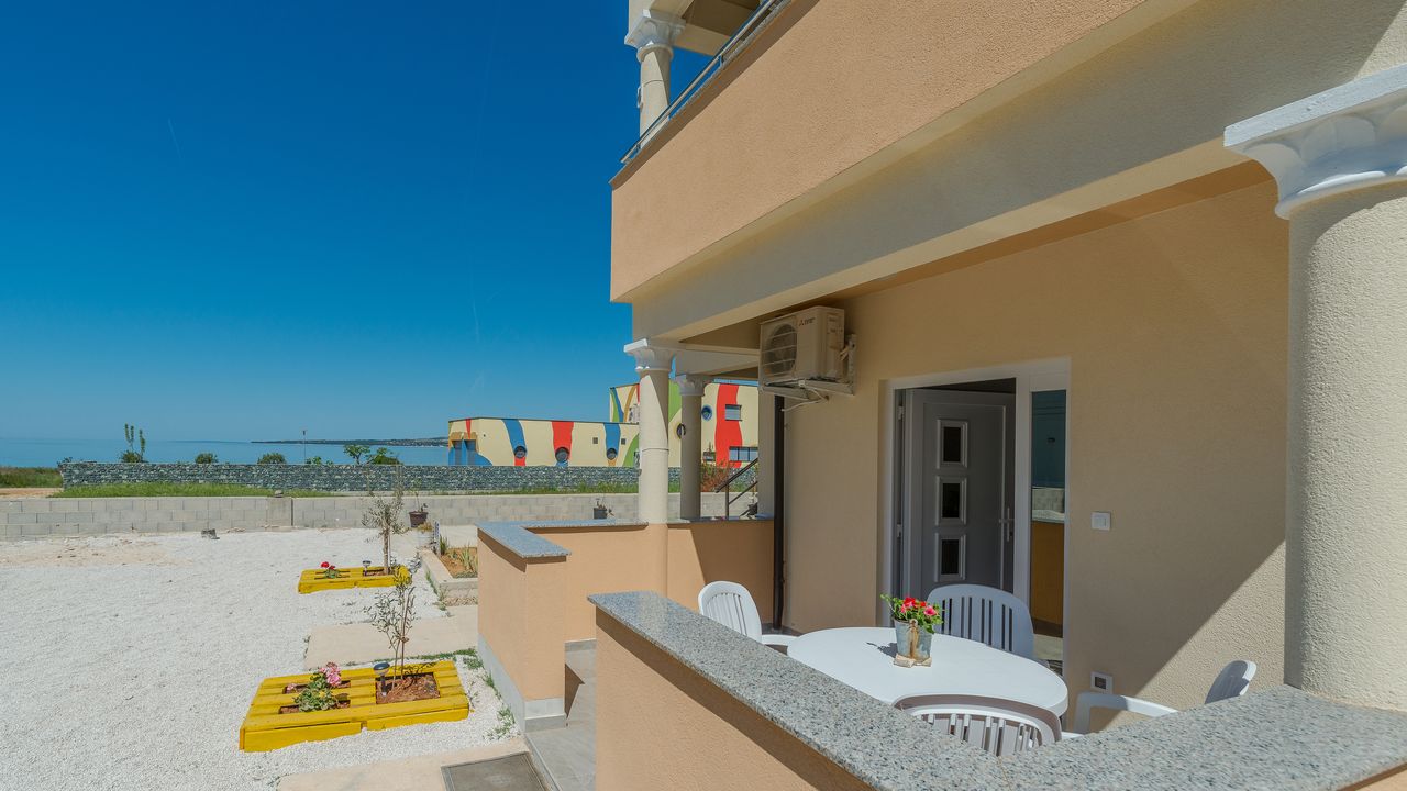 Modern eingerichtete Wohnung (45 m²) mit 4 * und ein Meerblick befindet sich in einer ruhigen Gegend in Privlaka, nur 8 km von der Inseln Vir.Die Nähe des Meeres und das umliegende mediterrane Grün machen diese Wohnung zu einem idealen Ort, um sich zu entspannen und dem Alltag zu entfliehen. Diese luxuriöse FeWo für 2 Personen befindet sich im Erdgeschoss und ist in ein Wohnzimmer mit Küche und Esszimmer, ein Doppelzimmer mit Doppelbett und ein Badezimmer mit Dusche aufgeteilt. Die Wohnung hat zwei überdachte und möblierte Terrassen mit Meerblick .Zu den weiteren Annehmlichkeiten gehören Klimaanlage, Sat-TV und Internet per WLAN .Im geräumigen Innenhof (1500 m²) gibt es Parkplatz, Grill, Sonnendeck mit Liegen und Außendusche. Entfernung zum Strand mit betonierte Liegeflächen und Pinienwald ist nur 30 m.